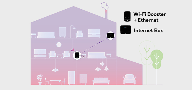 The Wi-Fi Booster+ is more advanced and ready for Wi-Fi 6E. It includes 2 Ethernet ports (10 Gbps and 2.5 Gbps) and works fully automatically. It features a front WPS button for quick connection and is ideal for ultra-fast, interference-free Wi-Fi. It is compatible only with the Internet Box+.