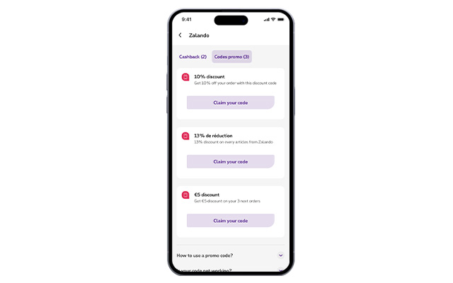 - Promo codes – instant discounts on various partner brands: browse the available deals, copy the code and paste it at checkout on the partner website.