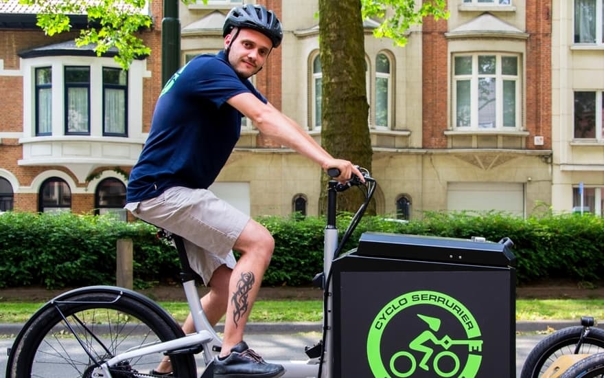 Voilà quatre ans que Kevin Vandergoten a lancé son activité de serrurier en tant qu’indépendant. Une progression logique après une quinzaine d’années de métier derrière lui. Mais dans une grande ville comme Bruxelles, l’offre de serruriers est particulièrement fournie. Alors comment se démarquer ? « C’est en tombant sur la vidéo d’un plombier se déplaçant à vélo à Paris que j’ai commencé à envisager cette possibilité », se remémore Kevin. À peu près un an plus tard, Cyclo Serrurier voyait le jour.