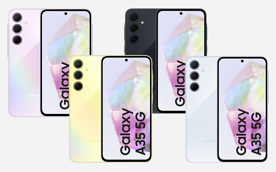 Le Samsung Galaxy A35 est disponible en 4 coloris: Iceblue, Navy, Lilac et Lemon.