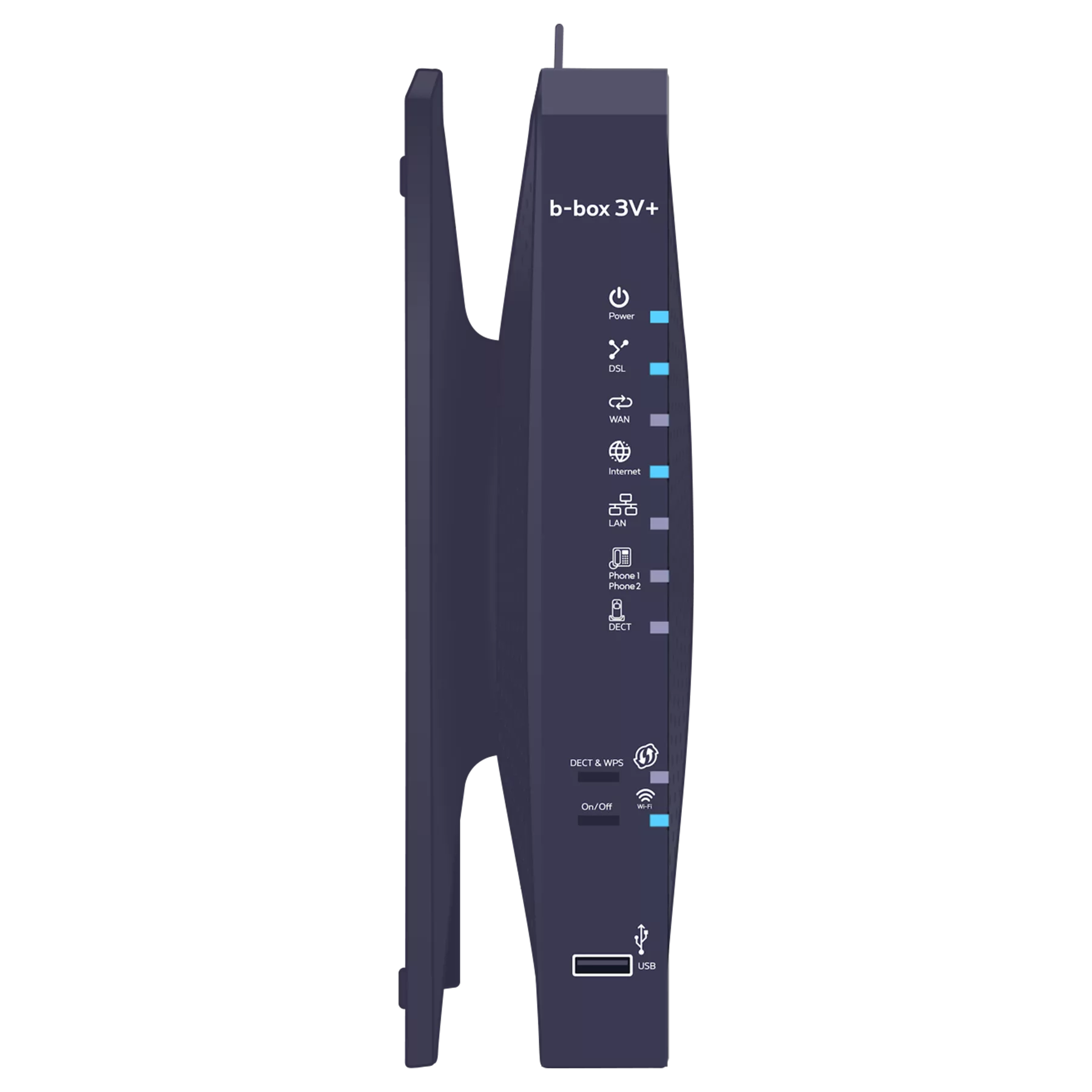 Bleu clignotant : une communication est en cours.Bleu clignotant : indique qu’une synchronisation WPS est possible avec un autre appareil wi-fi WPS (max. 2 minutes) ou que l’association d’un combiné DECT avec la b-box est possible.
