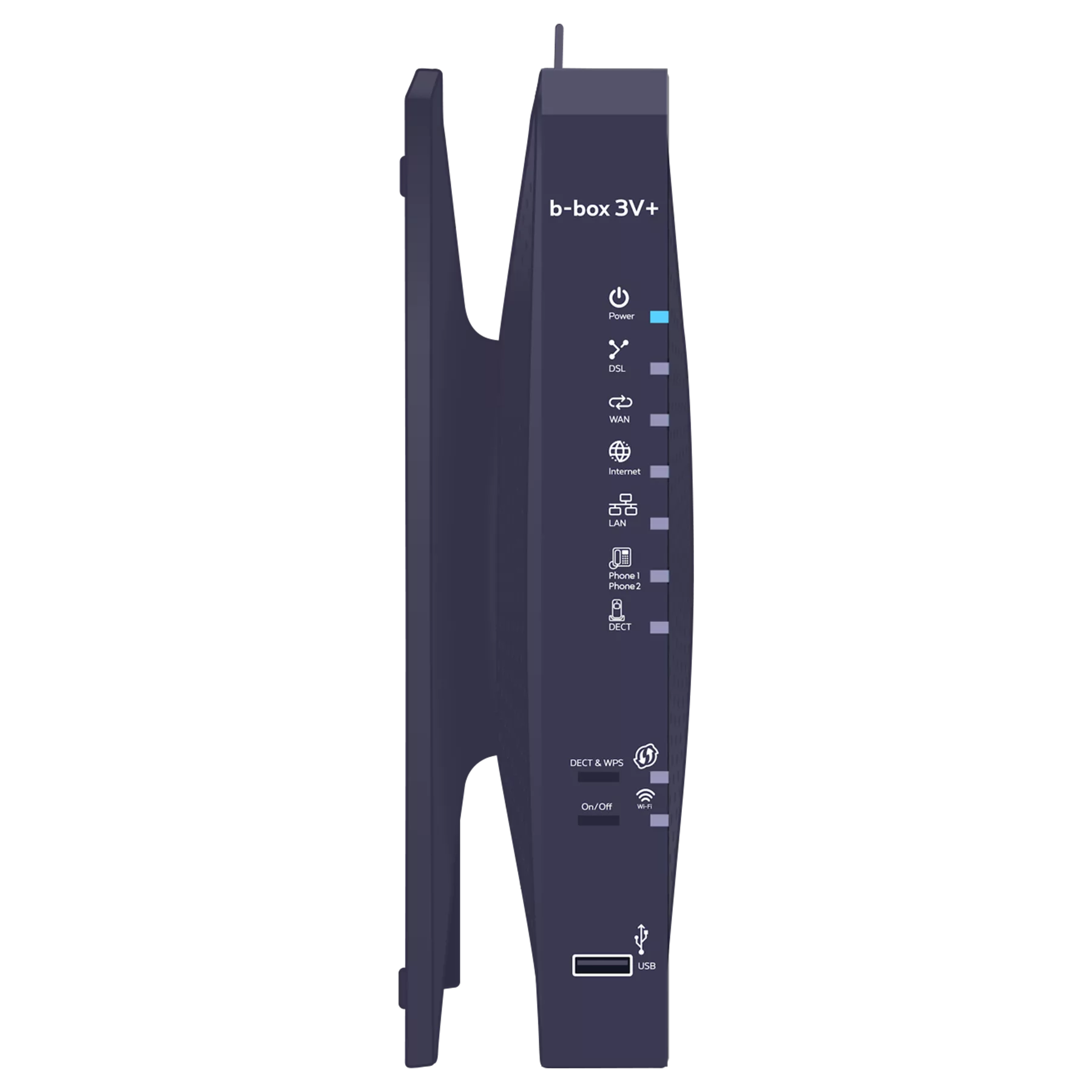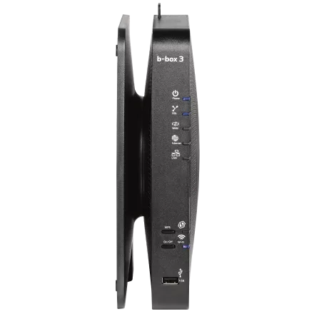 Bleu fixe : la b-box est allumée.Bleu fixe : la b-box est synchronisée.Bleu clignotant : la synchronisation est en cours (max. 3 minutes).Bleu fixe : il y a une connexion internet.Bleu fixe : au moins un port LAN est utilisé.Bleu fixe : le service de téléphonie est correctement configuré.Bleu clignotant : une communication est en cours.Bleu fixe : au moins un combiné sans fil (DECT) est connecté.Bleu clignotant : une communication est en cours.Bleu clignotant : indique qu’une synchronisation WPS est possible avec un autre appareil wi-fi WPS (max. 2 minutes) ou que l’association d’un combiné DECT avec la b-box est possible.Bleu fixe : la fonctionnalité wi-fi est établie.