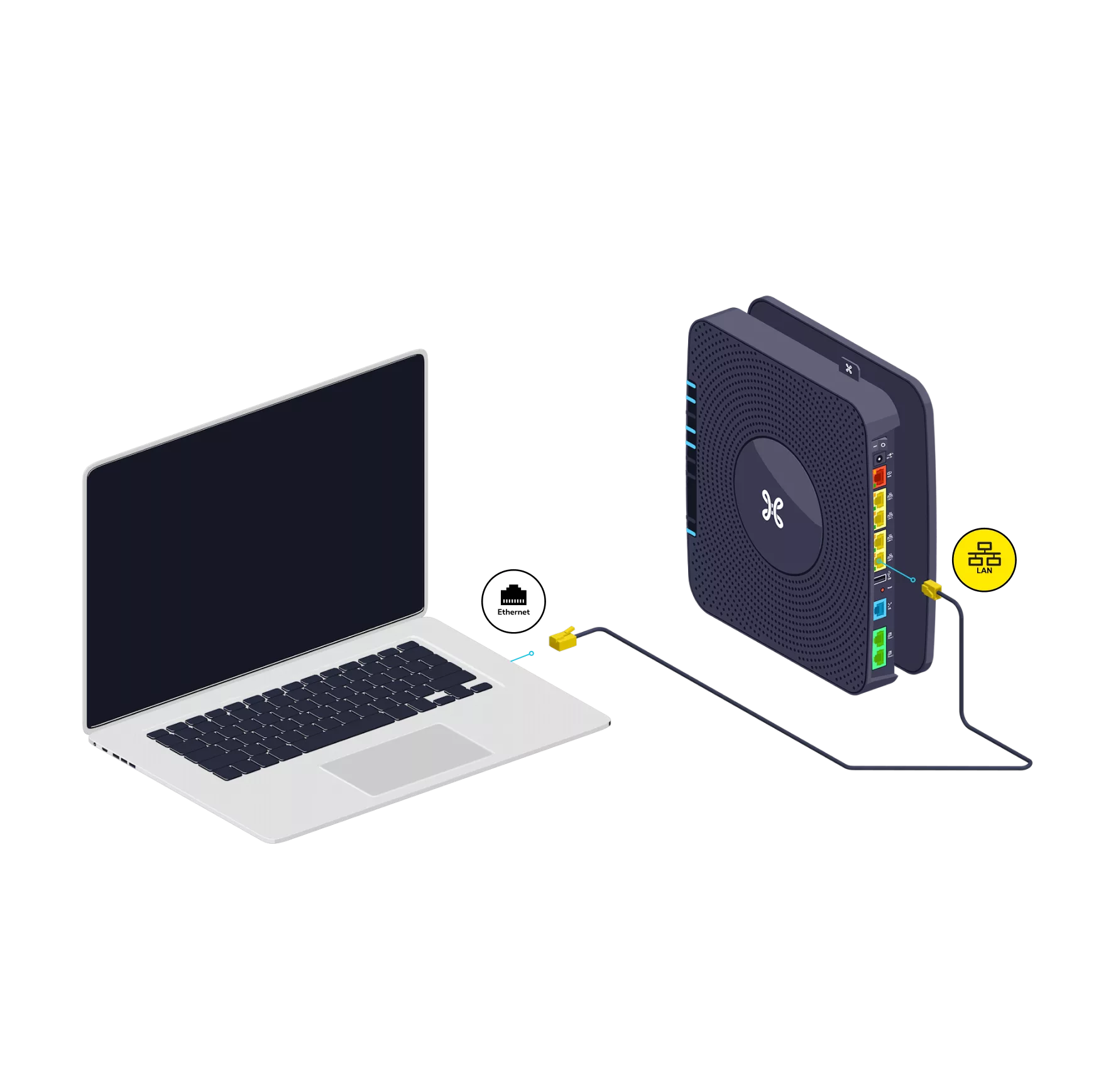 Utilisez le câble ethernet et branchez-le à l’un des ports jaunes LAN à l’arrière de la b-box et démarrez votre ordinateur.