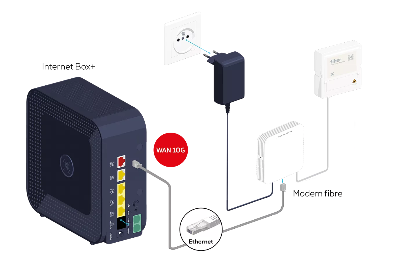 Utilisez de préférence le câble Ethernet gris fourni avec le modem fibre. Sinon utilisez le câble Ethernet à embouts rouges livré avec l’Internet Box+ et branchez-le au port rouge WAN 10G à l’arrière de l’Internet Box+.