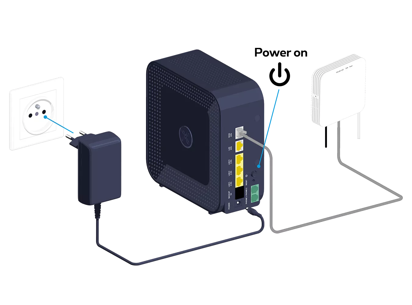 Vérifiez si les témoins Power et PON sont allumés sur le modem fibre. Si ce n’est pas le cas, appuyez sur le bouton ON pour les allumer.