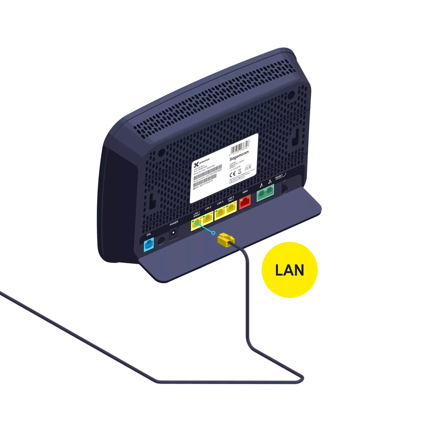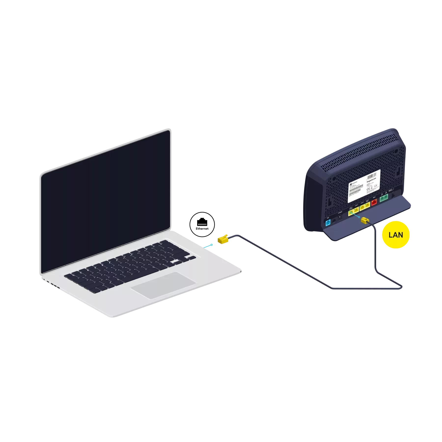 Utilisez le câble ethernet et branchez-le à l’un des ports jaunes LAN à l’arrière de l’Internet Box et démarrez votre ordinateur.