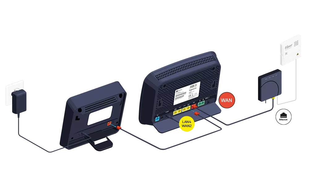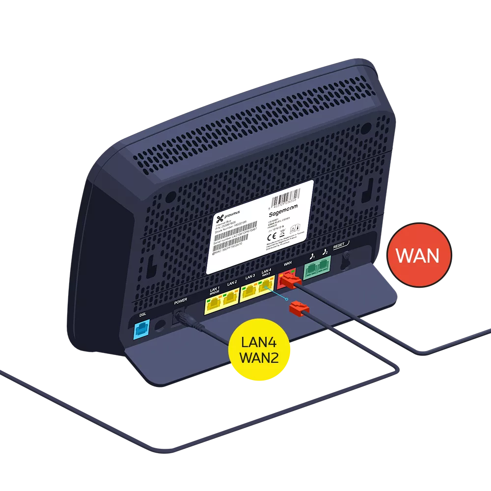 Utilisez le câble ethernet et branchez-le au port ethernet WAN2 jaune à l’arrière de l'Internet Box. Branchez l’autre extrémité du câble au modem 4G.