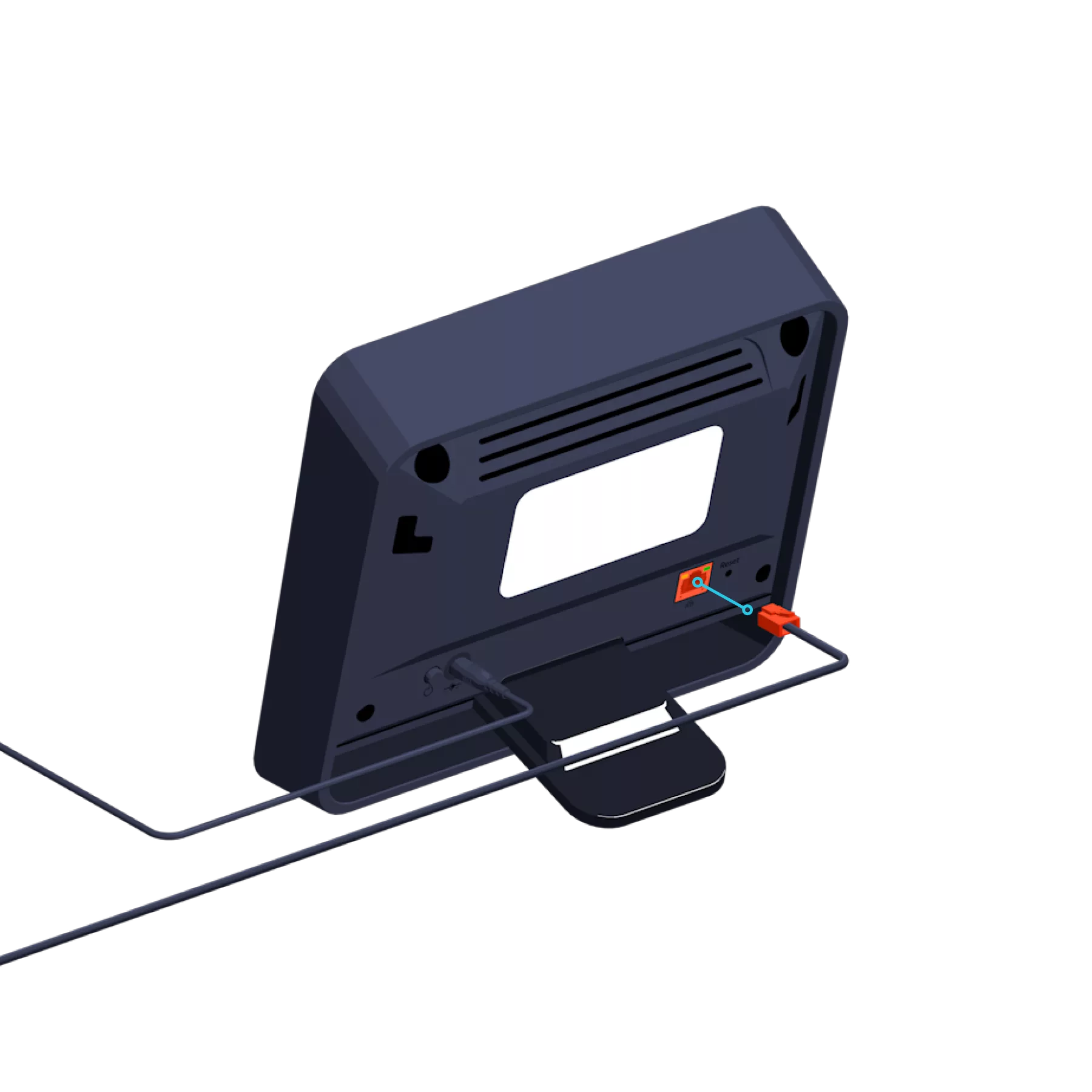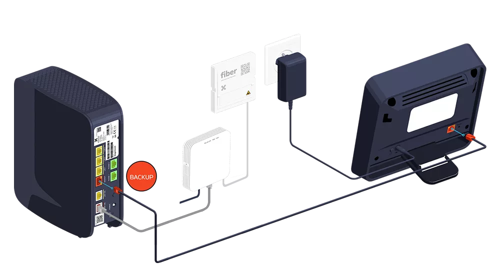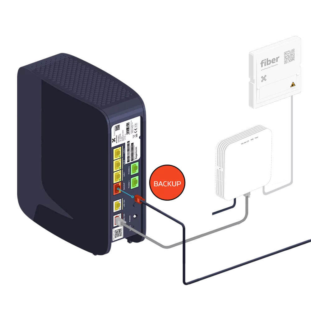 Utilisez le câble Ethernet et branchez-le au port Ethernet « backup » rouge après, le cas échéant, avoir retiré la pièce en plastique qui prévient l’usage incorrect du port à l’arrière de l’Internet Box+. Branchez l’autre extrémité du câble au modem 4G.