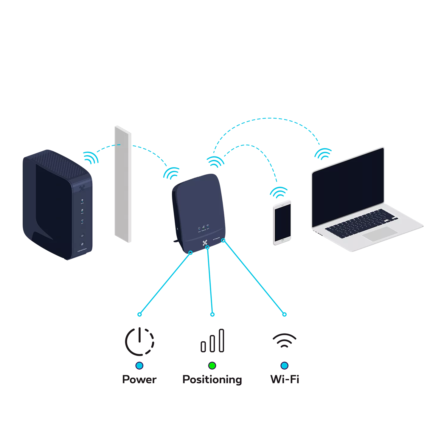 idéalement sans trop d’obstacles entre le Wi-Fi Booster et l'Internet Box+: les murs en béton, les plafonds, les miroirs, les portes et les armoires fermées peuvent affaiblir le signal wi-fi