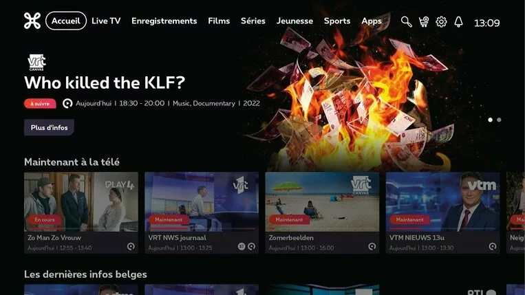 Accueil : vous trouvez ici un aperçu des programmes les plus populaires, des recommandations personnalisées et des raccourcis vers vos abonnements et services de streaming. Y sont également répertoriés les programmes ajoutés à ‘Ma liste’ ainsi que ceux que vous avez déjà commencés à regarder.