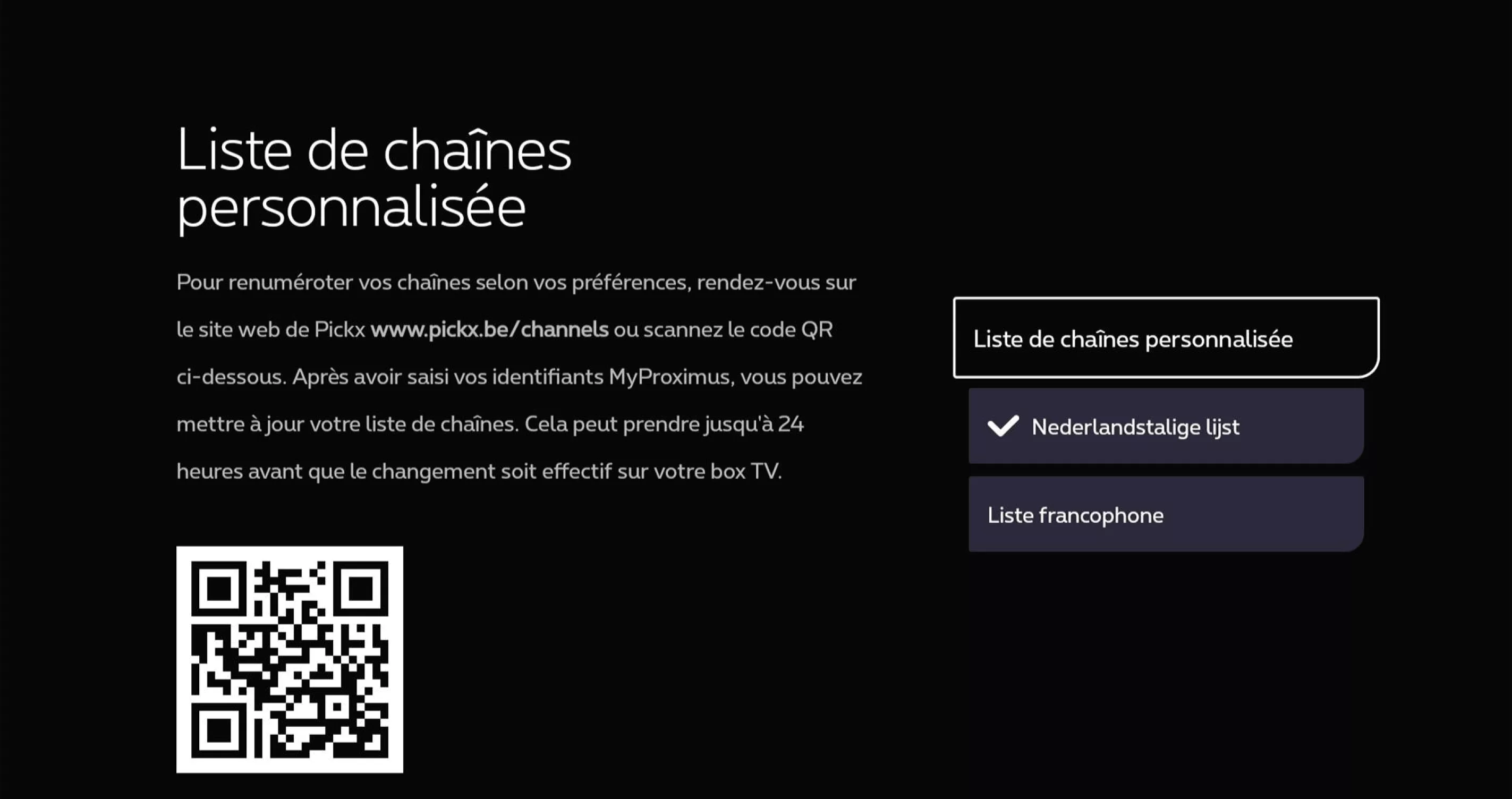 Vous pouvez y trouver un code QR pour personnaliser vos chaînes via pickx.be ou choisir une liste de chaînes par défaut en français ou en néerlandais.