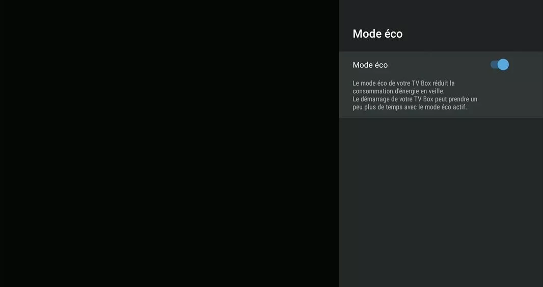pour activer le mode éco.Votre TV Box consomme alors seulement 0,005 watt. Le redémarrage de votre TV Box prend alors 1 à 2 minutes.