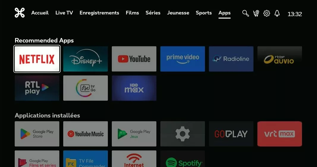 Lors de l’installation de votre TV Box, vous avez la possibilité de vous connecter au Google Play Store (avec votre nom d’utilisateur et votre mot de passe). Vous aurez ainsi accès aux apps (Disney+, YouTube, Netflix, Spotify, Twitch…) pour votre TV.