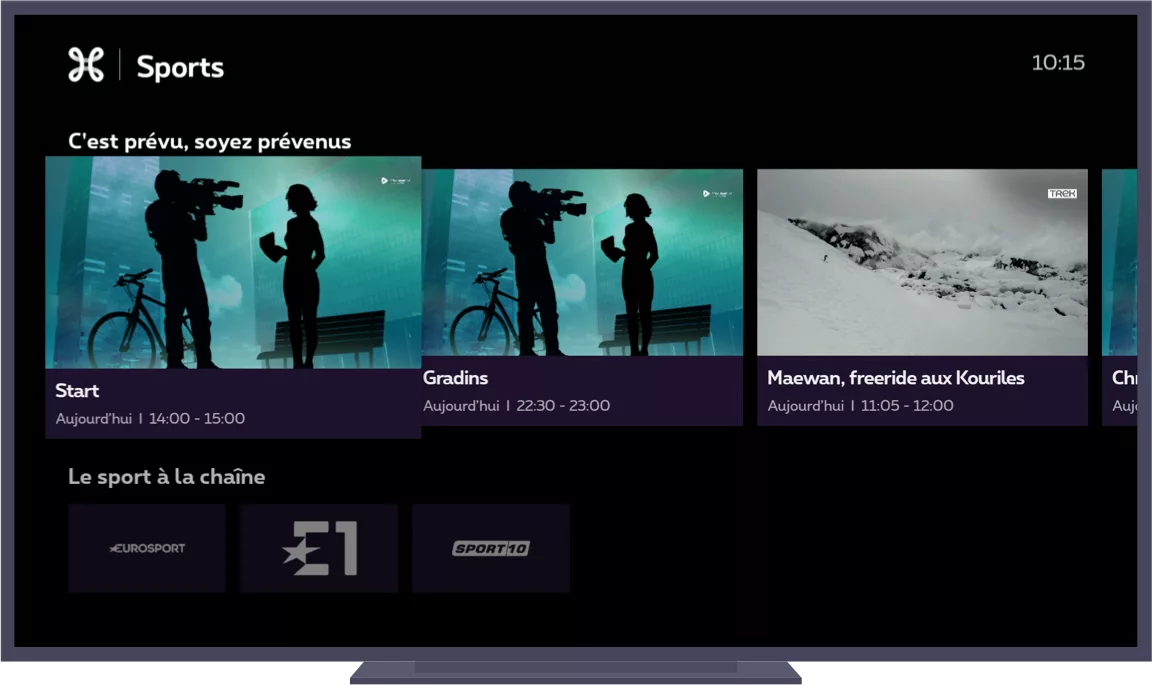 Sports : tous les programmes et événements sportifs disponibles, en direct, en différé ou en location (catalogue à la demande). Avez-vous une option TV ? dans ce cas, vous retrouverez également ces programmes ici.