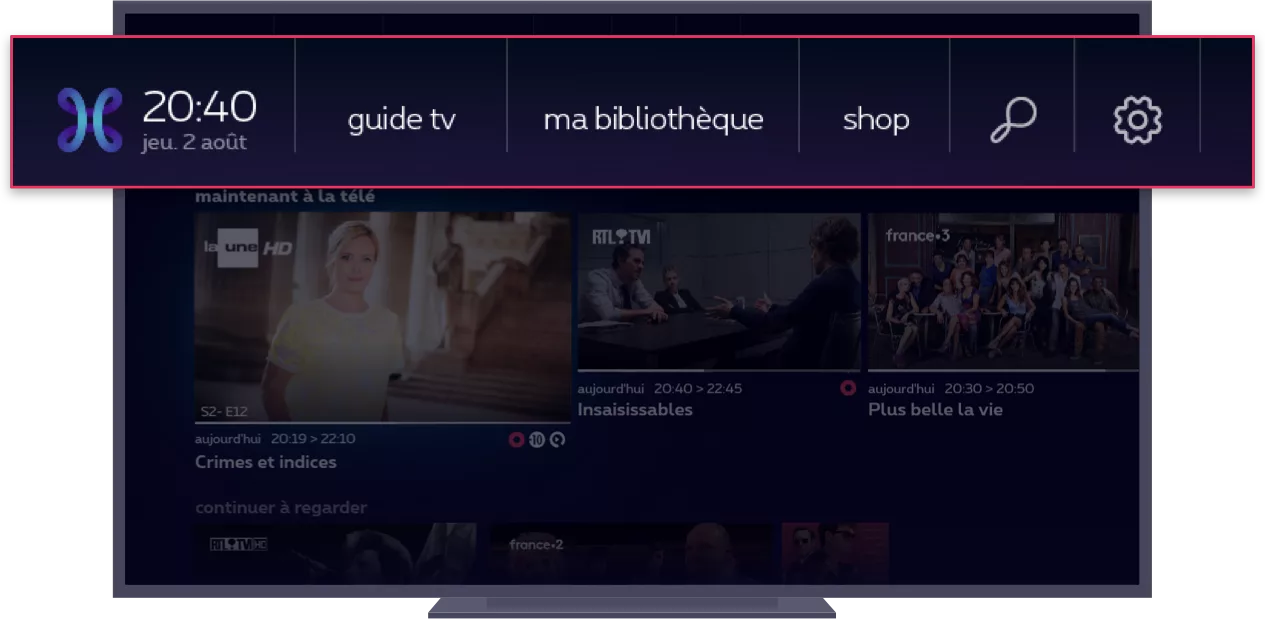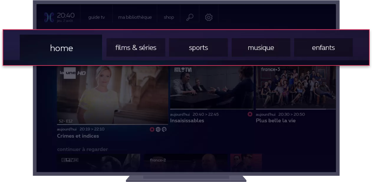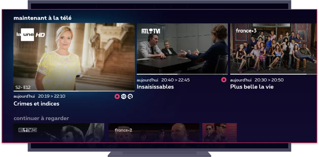 Les programmes et recommandations personnalisés sont présentés par catégories (par ex : "maintenant à la télé", "ça pourrait bien vous plaire", "bientôt à la télé", ...).