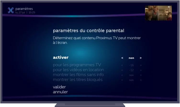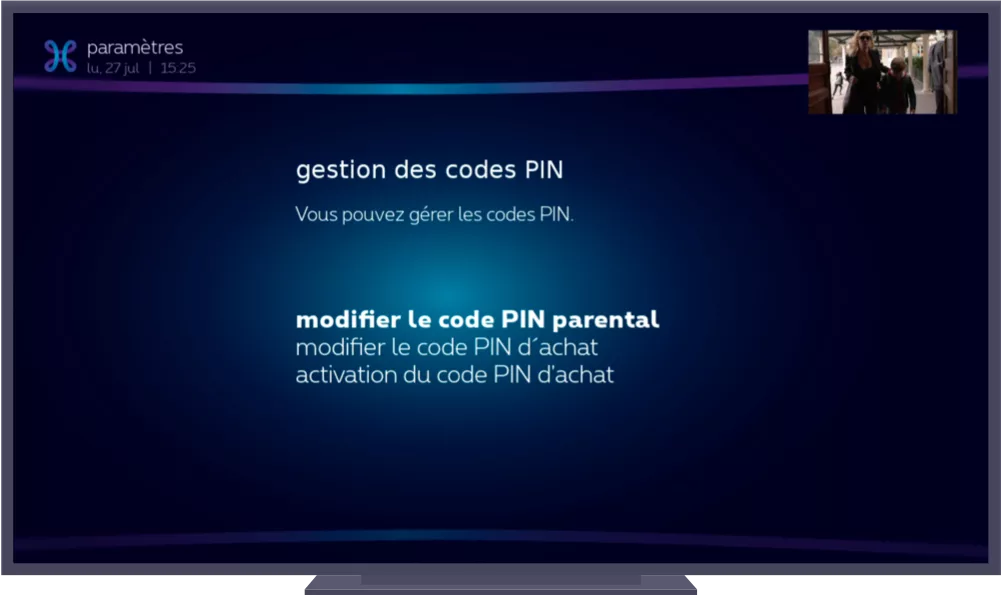 Vous devrez introduire un code PIN parental pour valider toute modification et pour accéder à du contenu bloqué. Par défaut, le code PIN parental est 1234 (sauf si vous l’avez modifié).