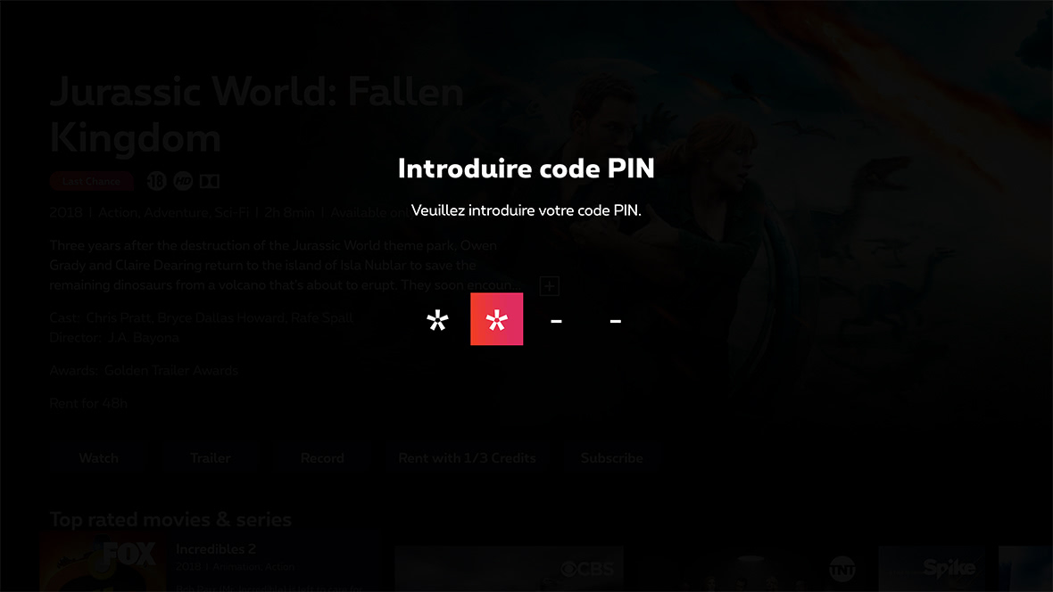 Le code PIN parental est par défaut 1234, sauf si vous l’avez déjà modifié. Vous avez introduit un mauvais numéro ? Utilisez les touches directionnelles pour vous déplacer et réintroduisez le bon code. Oublié votre code PIN ? Appelez gratuitement le 0800 99 696.