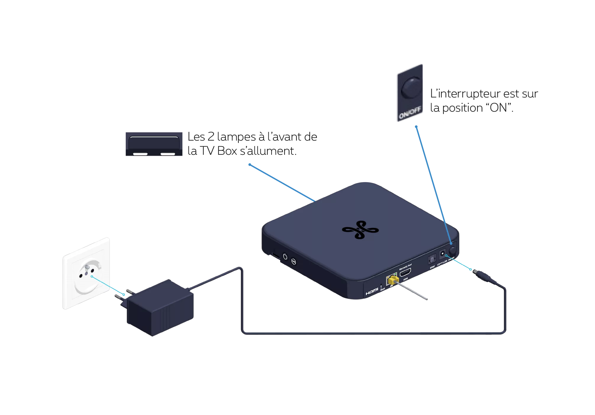 Branchez le câble d’alimentation sur votre TV Box et sur une prise électrique.