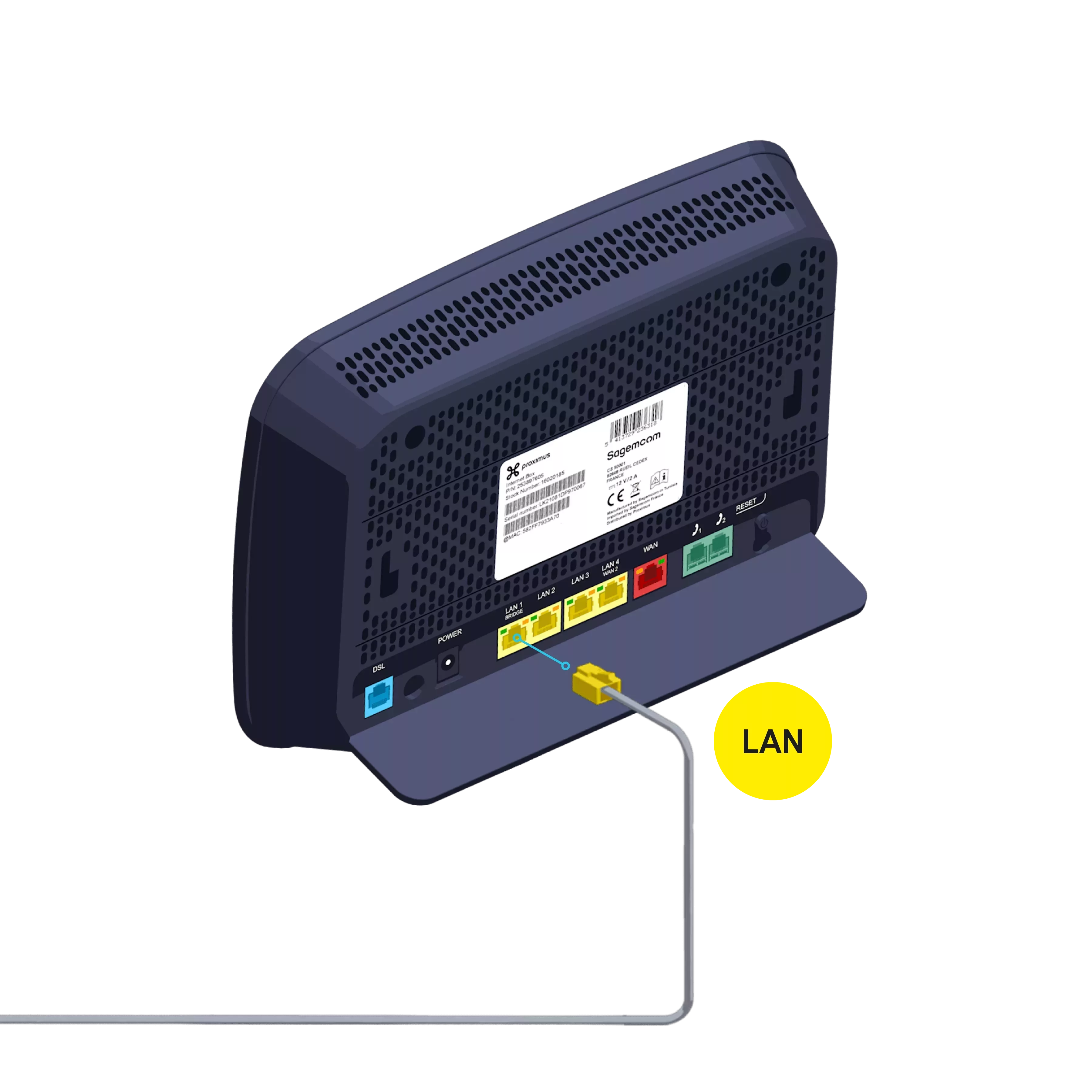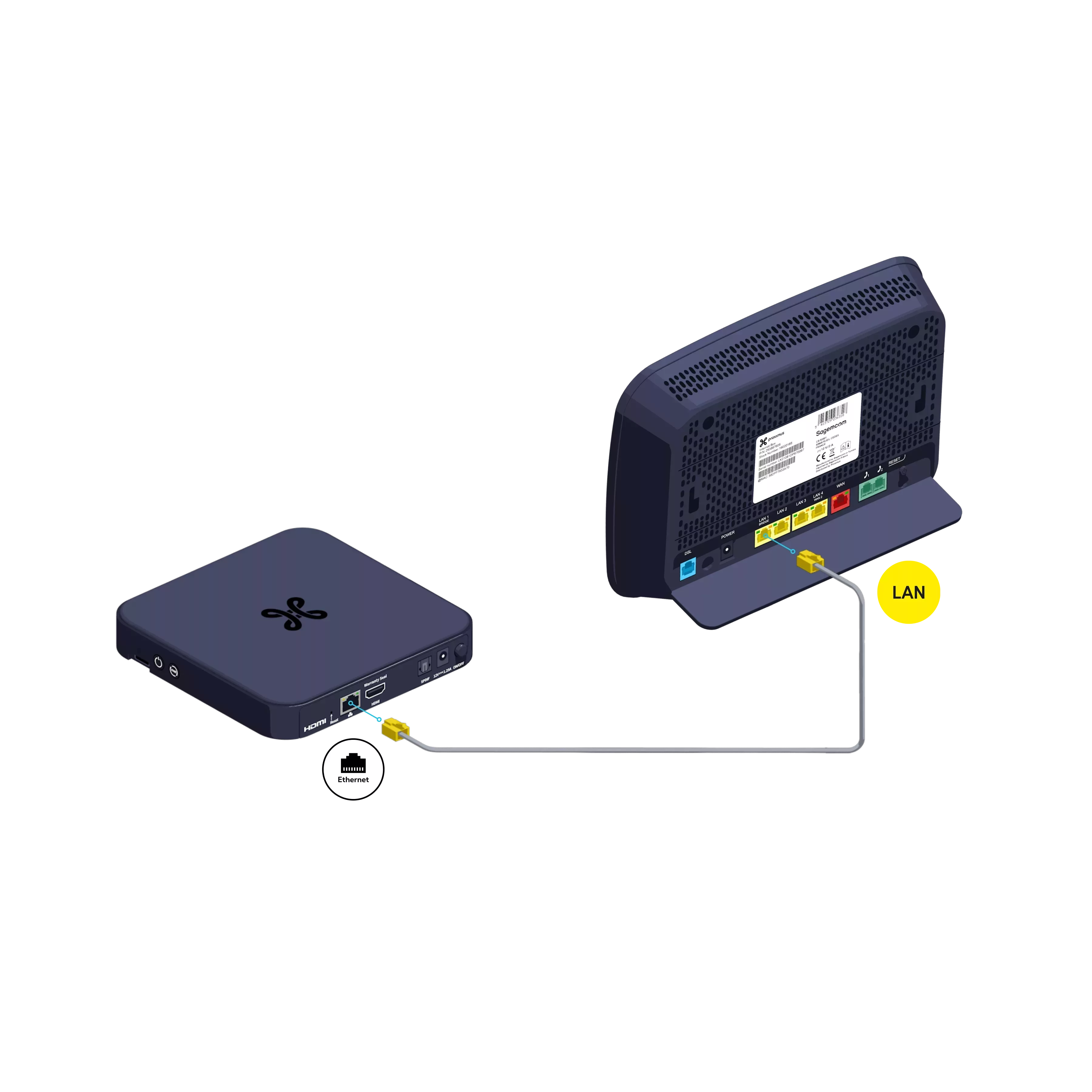 Utilisez le câble ethernet et branchez-le à l’un des ports jaunes LAN à l’arrière de l’Internet Box.