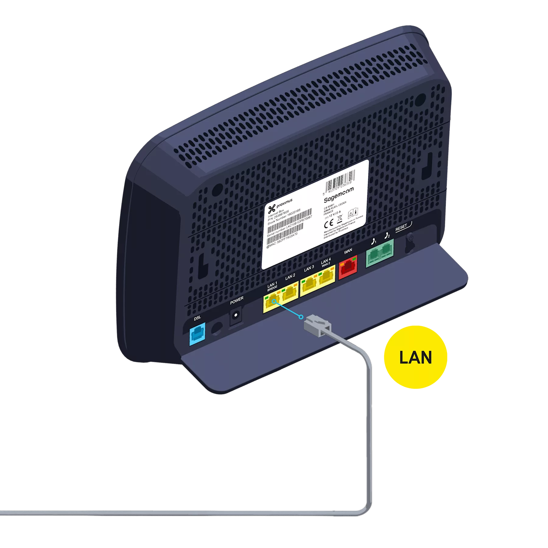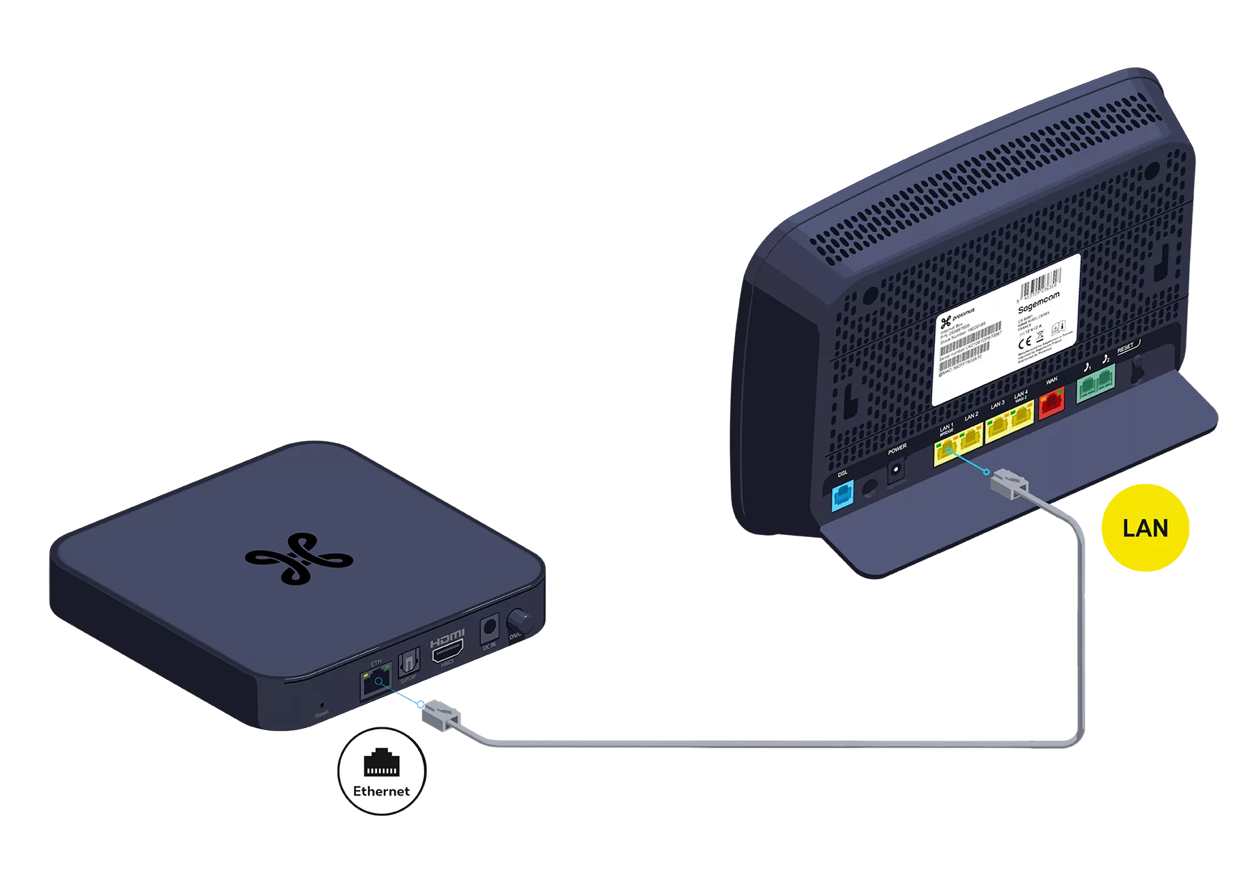 Utilisez le câble ethernet et branchez-le à l’un des ports jaunes LAN à l’arrière de l'Internet Box.