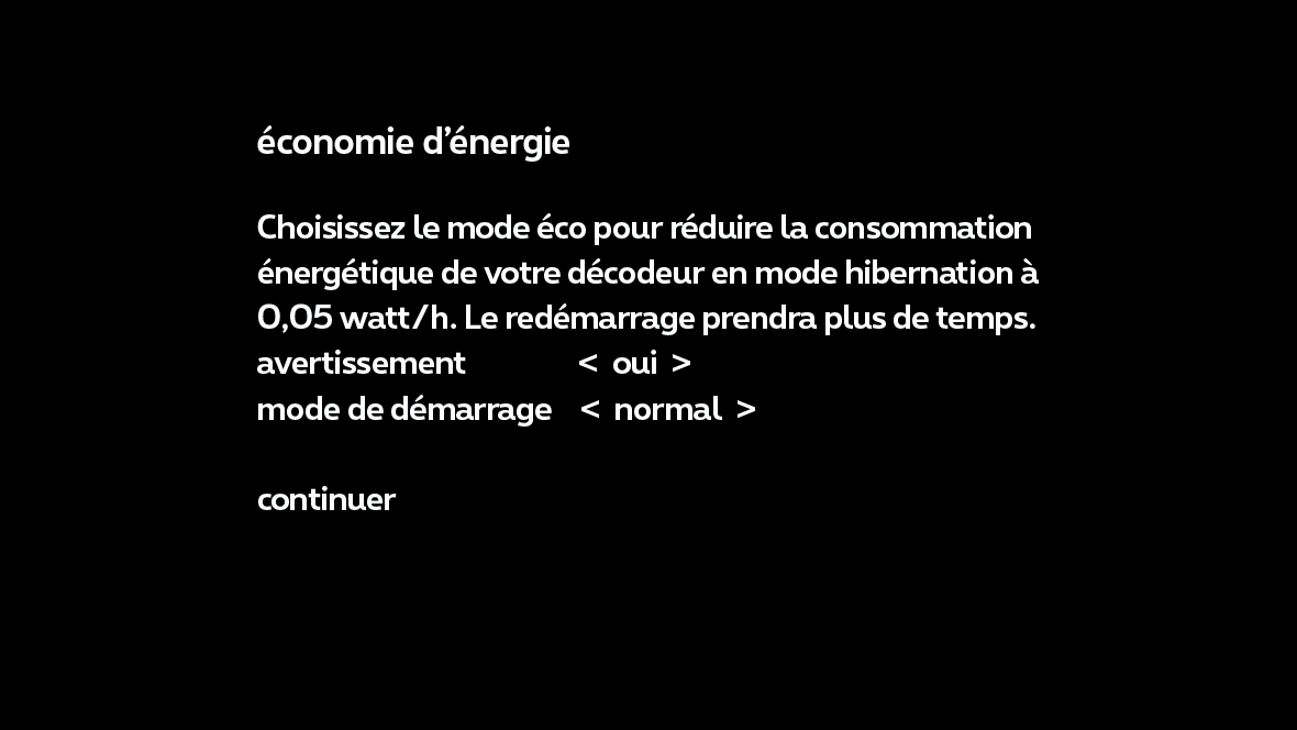 Votre TV Box vous propose plusieurs modes de mise en veille :- Normal : consommation de 0,20 watt, le redémarrage est instantané.