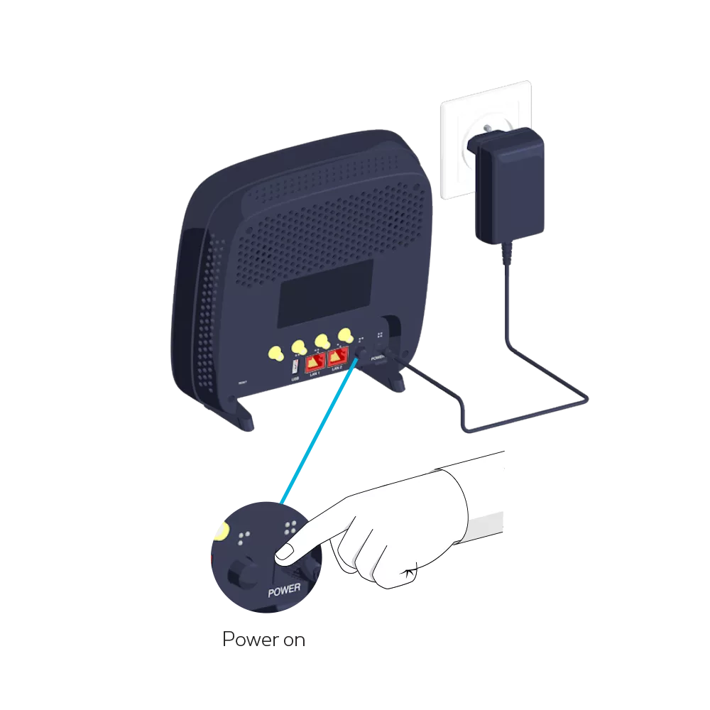 Steek de elektrische voedingskabel in de 5G-modem en de stekker in het stopcontact.