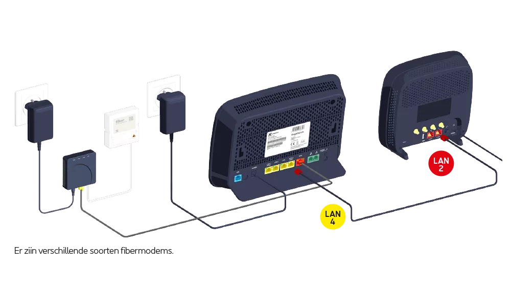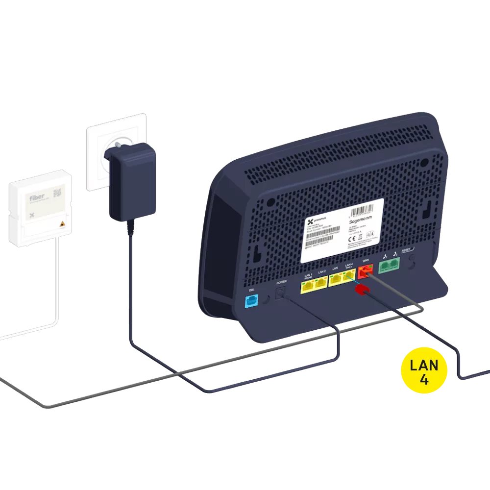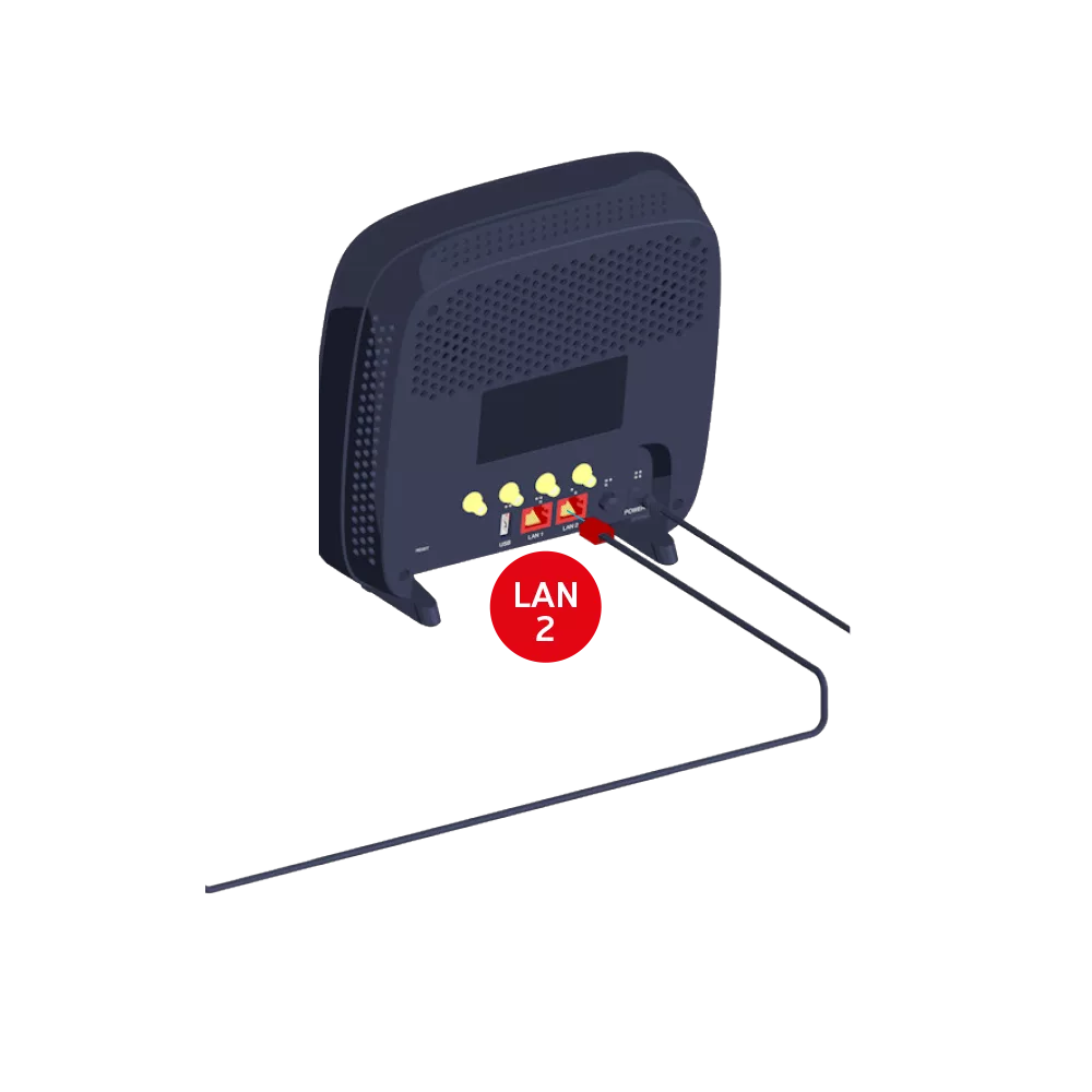 Steek de ethernetkabel in de geel LAN4-poort aan de achterkant van de Internet Box. Sluit het andere uiteinde van de ethernetkabel in de rode LAN 2-poort van de 5G-modem.