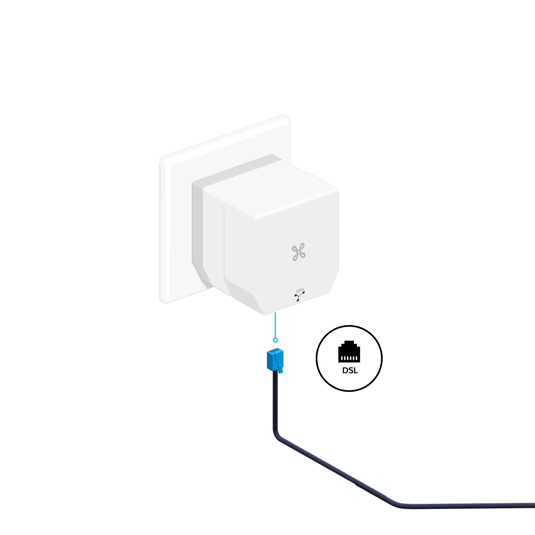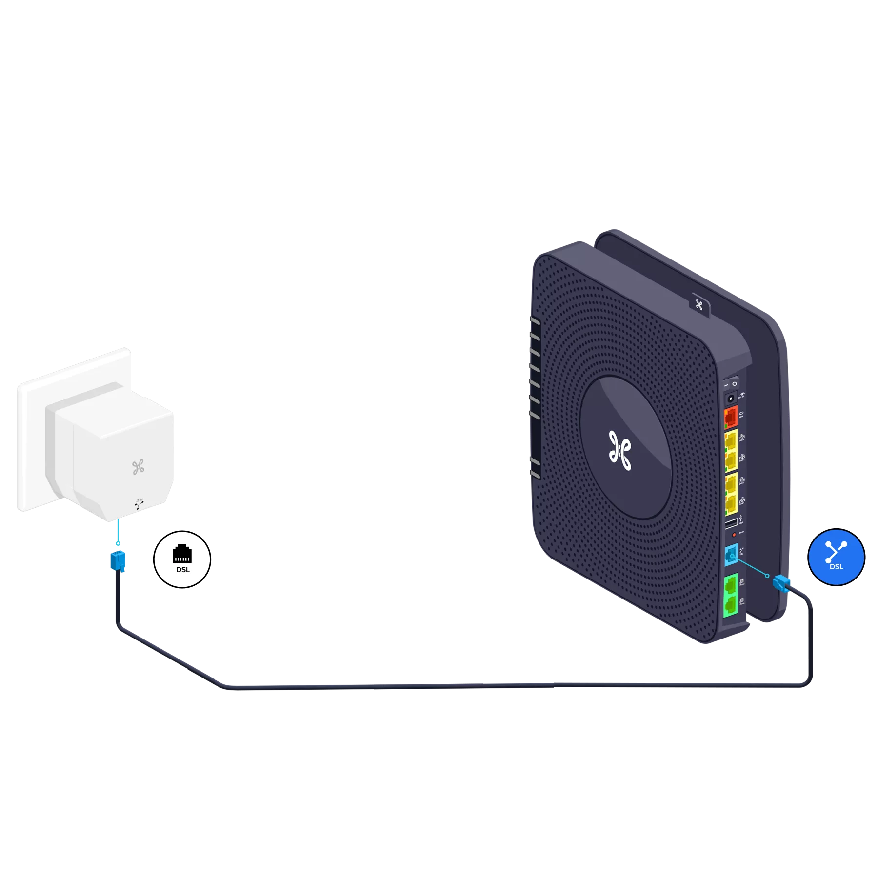 Gebruik de DSL-kabel en steek hem in de blauwe DSL-poort aan de achterkant van de b-box.