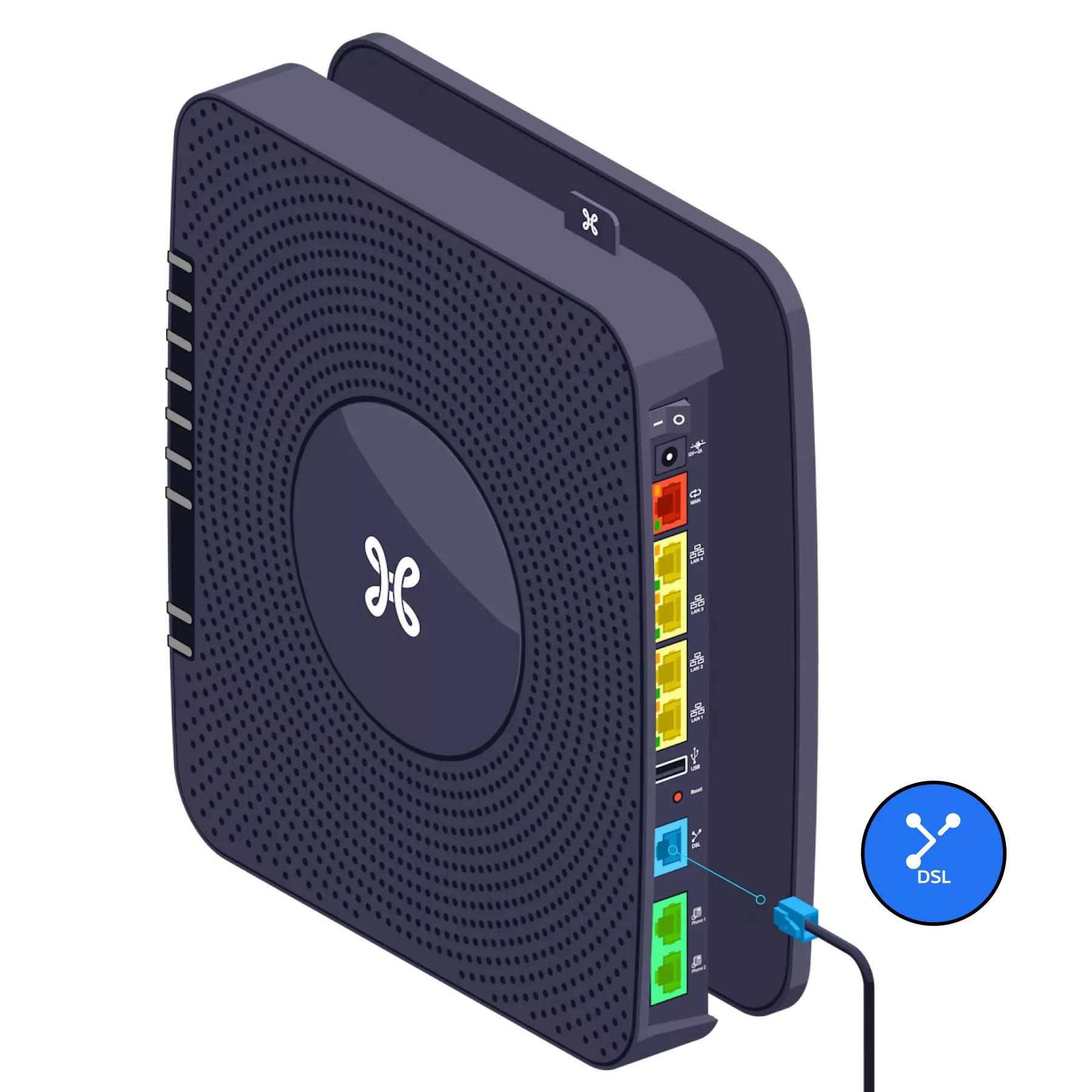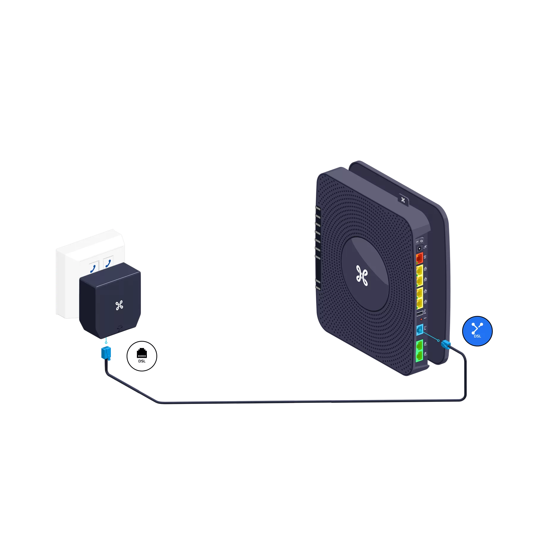 Als je de b-box in de buurt van de DSL-aansluitdoos plaatst, gebruik dan de DSL-kabel en sluit deze aan op de blauwe DSL-poort aan de achterkant van de b-box.