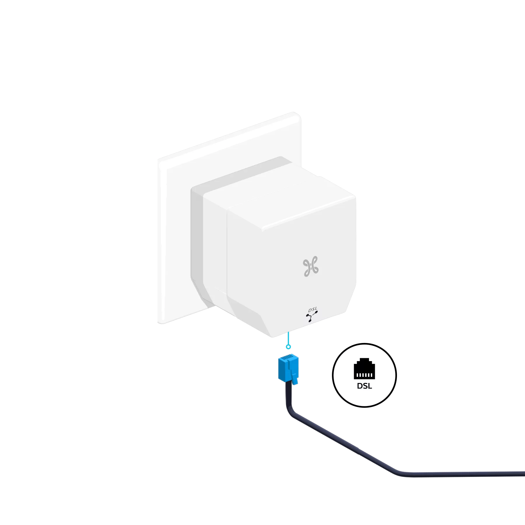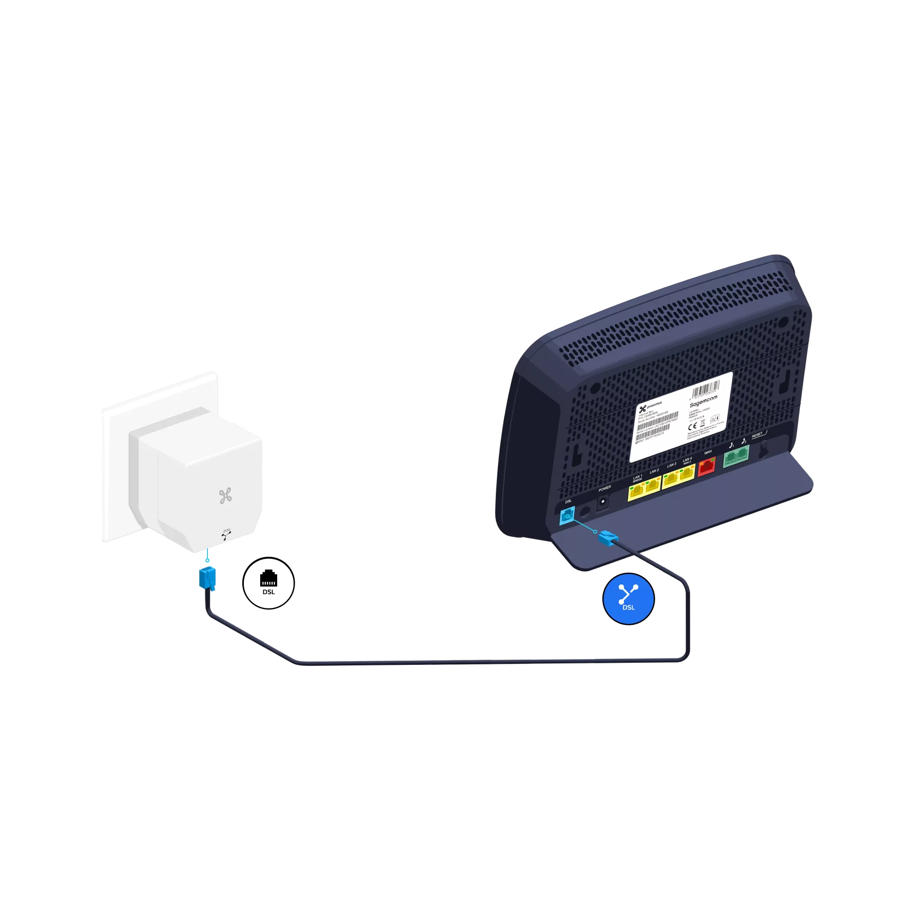 Gebruik de DSL-kabel en steek hem in de blauwe DSL-poort aan de achterkant van de Internet Box.