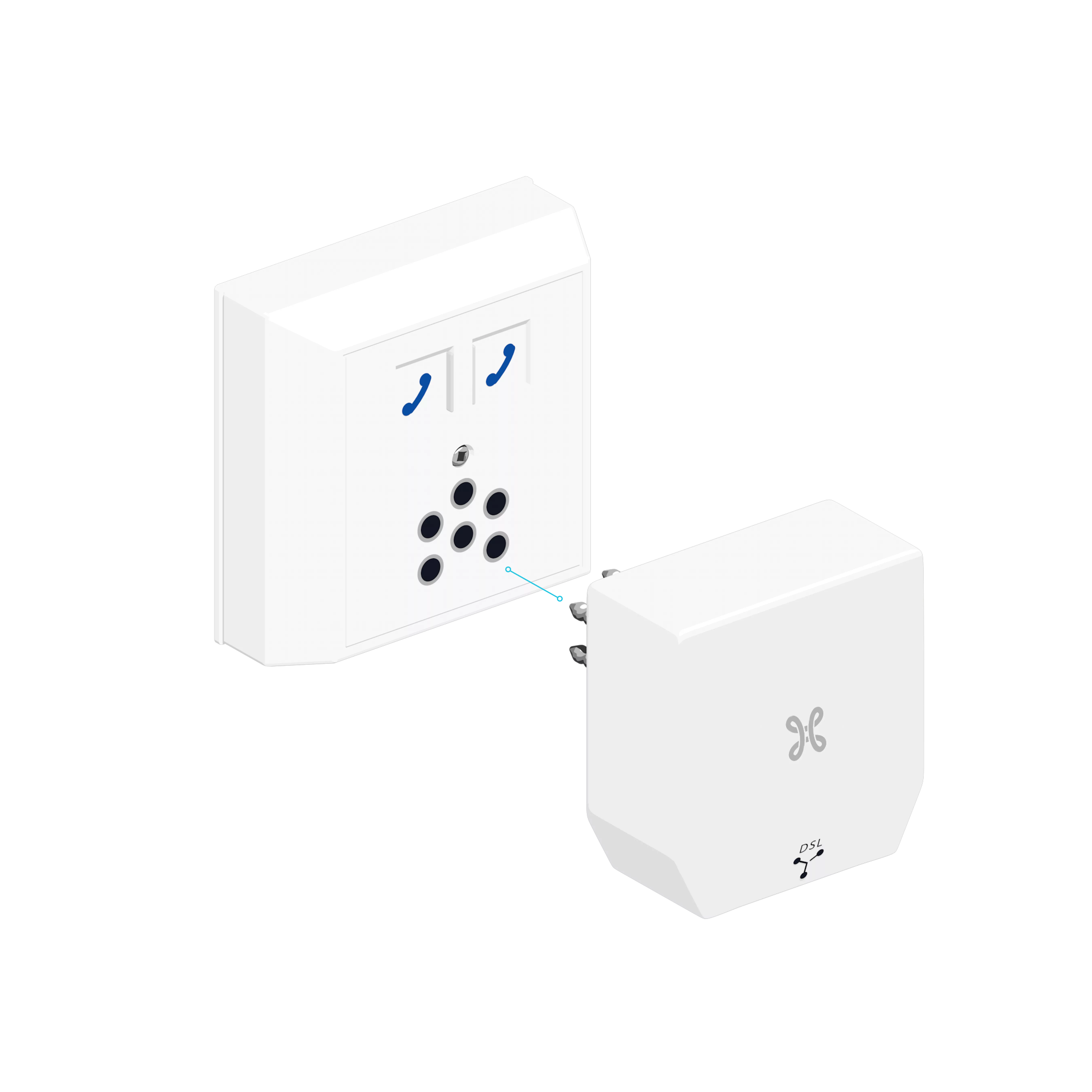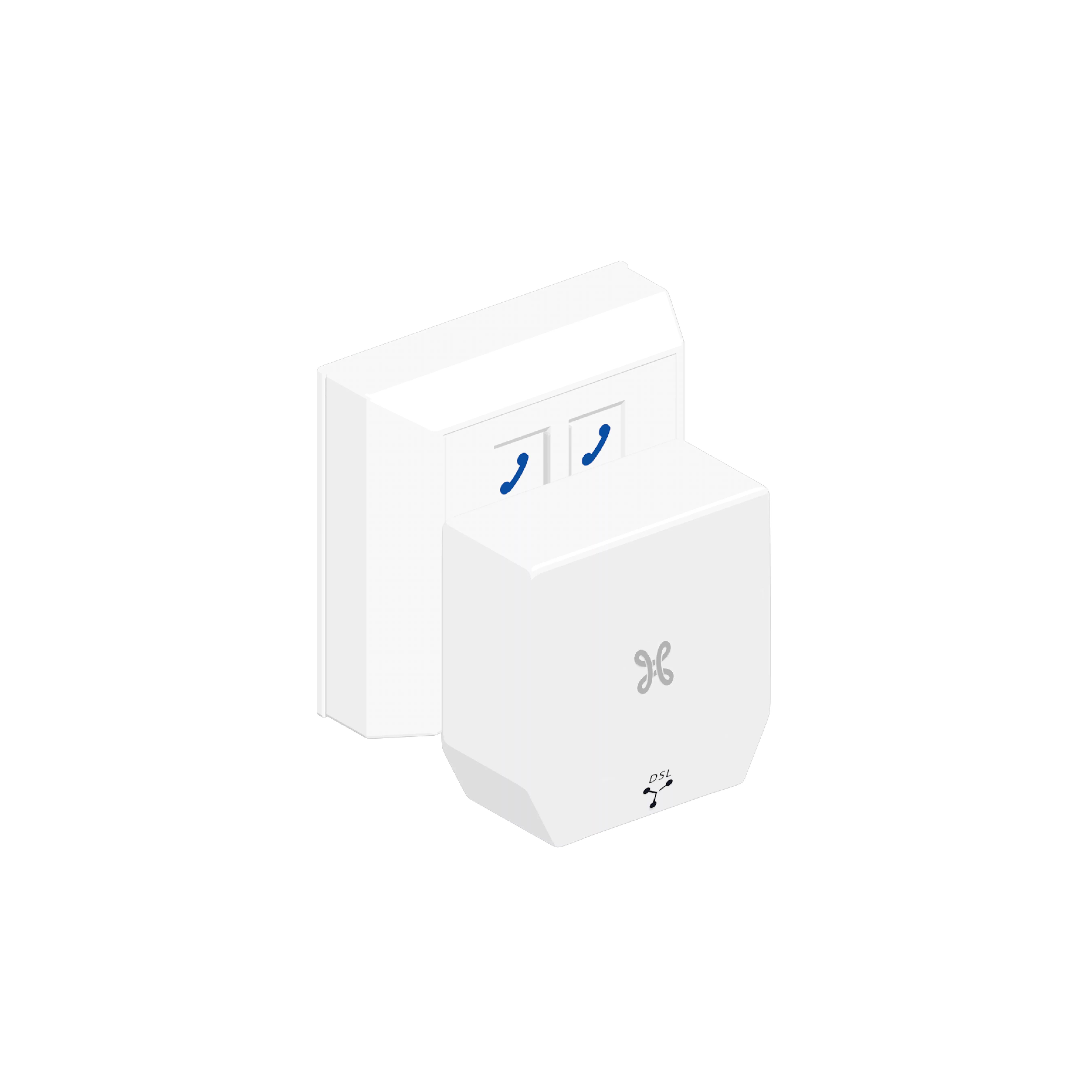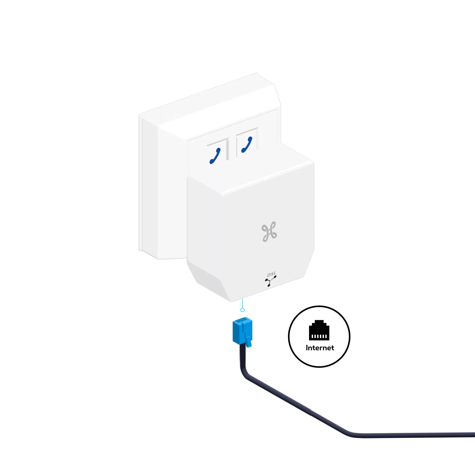 - Gebruik dan de speciale kabel bestemd voor de aansluiting van je Internet Box om de DSL-aansluitdoos met het telefoonstopcontact te verbinden.
