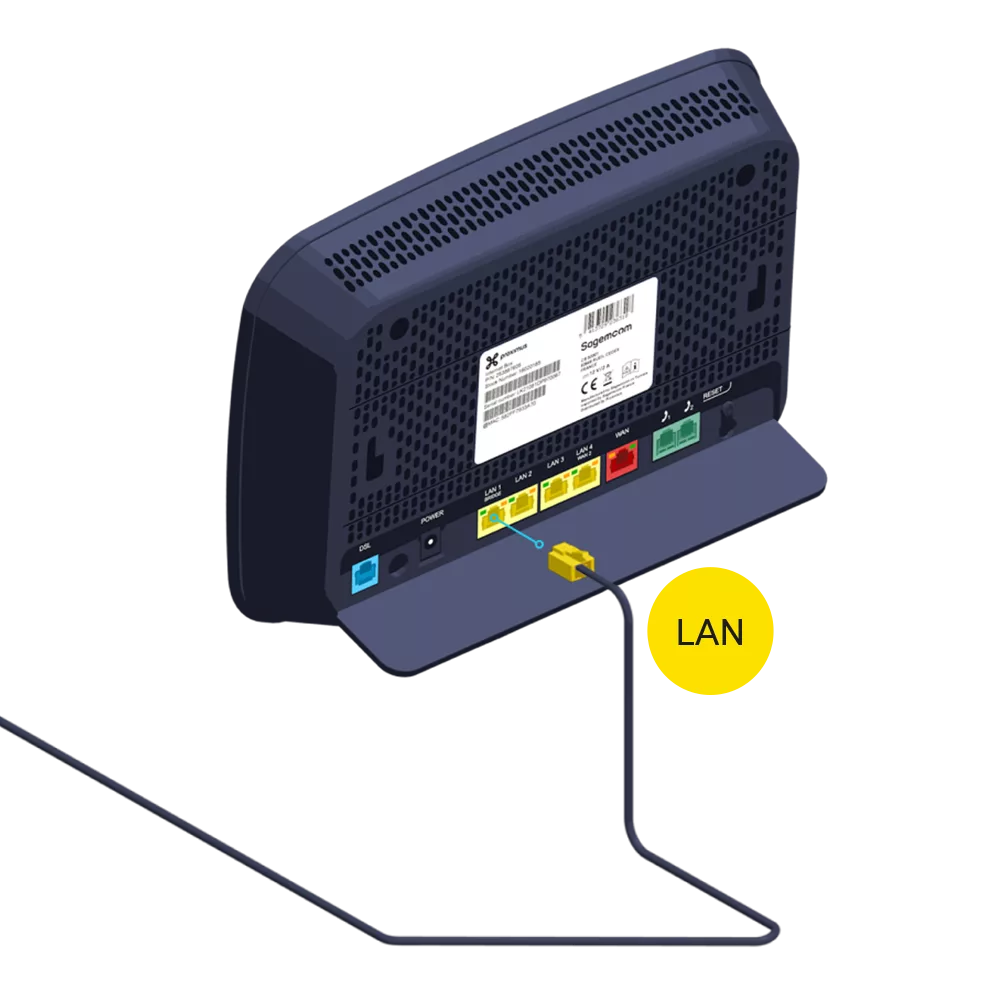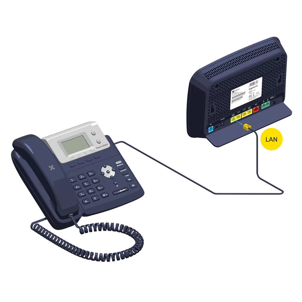 Gebruik de ethernetkabel en sluit hem op een van de gele poorten aan achteraan de Internet Box. Je telefoon wordt automatisch ingesteld na ongeveer 30 minuten.