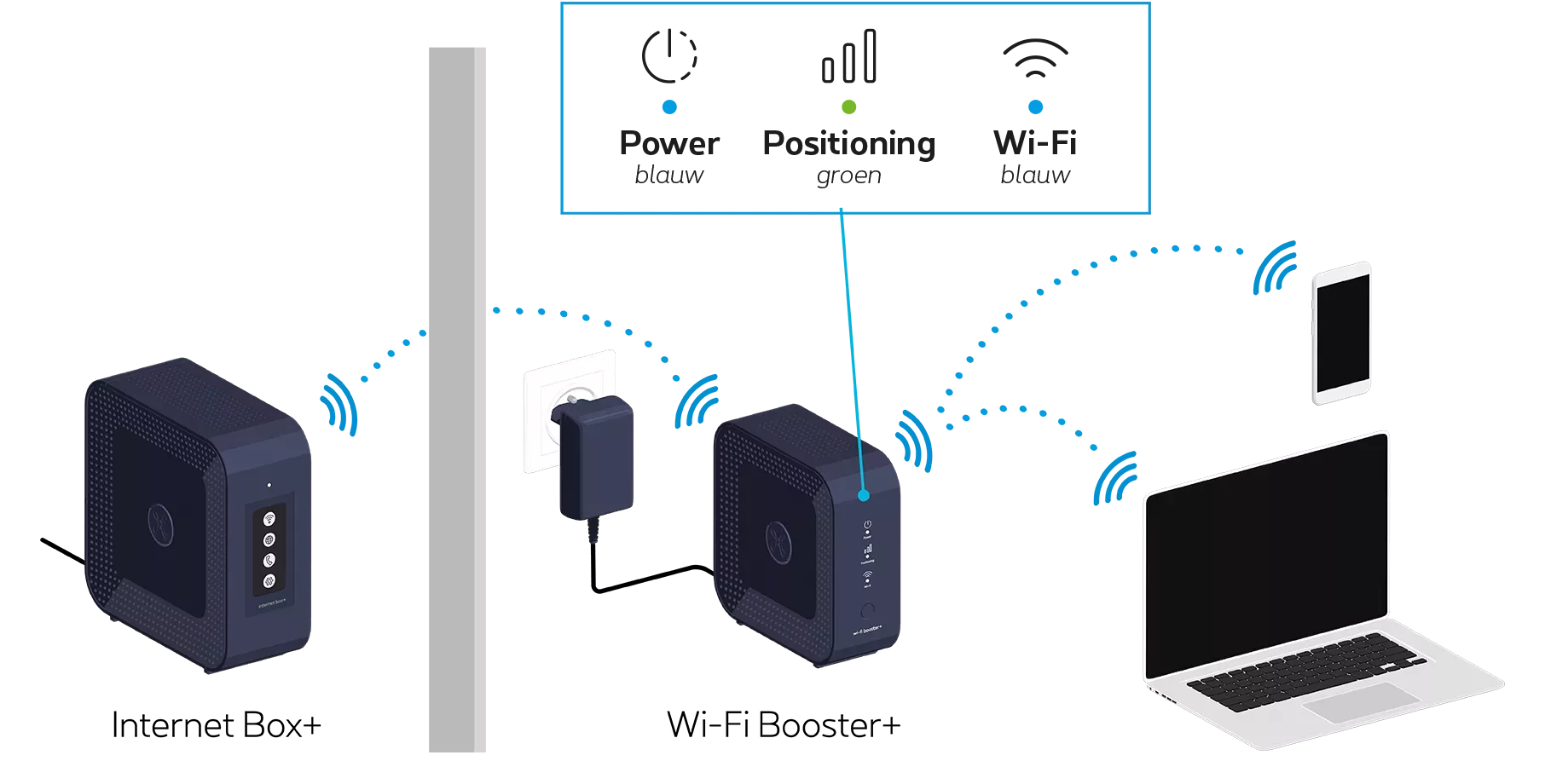 Je kan de Wi-Fi Booster+ nu uittrekken en ergens centraal plaatsen tussen de Internet Box+ en het toestel dat het wifi-signaal moet ontvangen.
