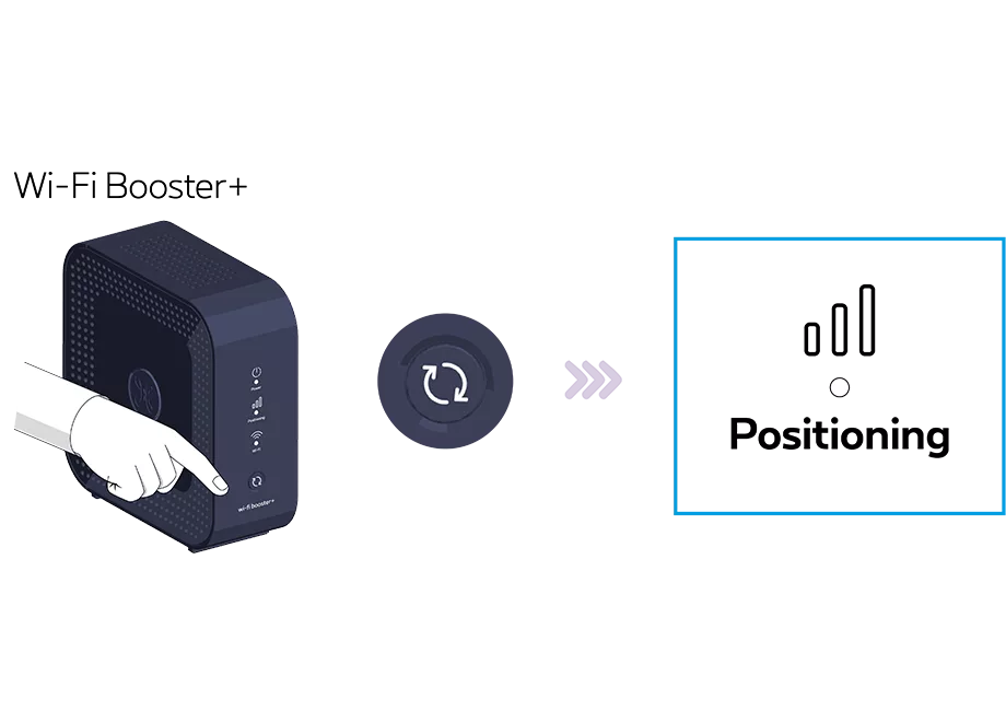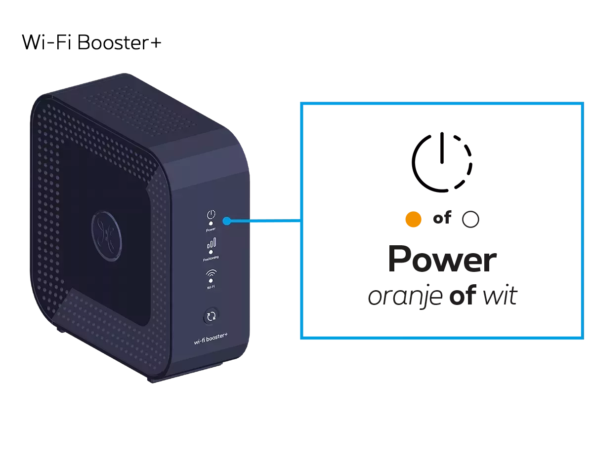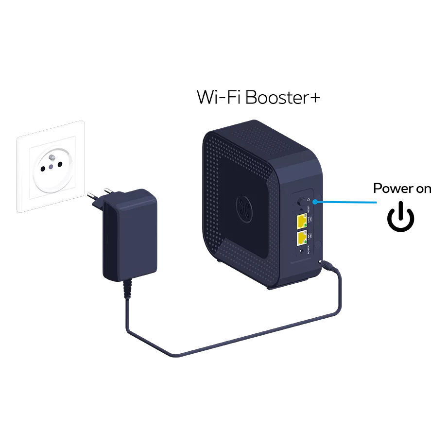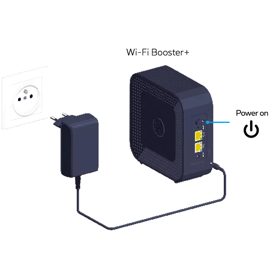 Steek de voedingskabel van de Wi-Fi Booster+ in een stopcontact in dezelfde ruimte als de Internet Box+. Druk op de POWER-knop.