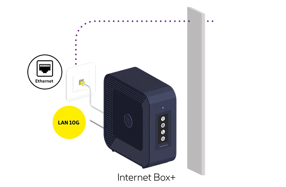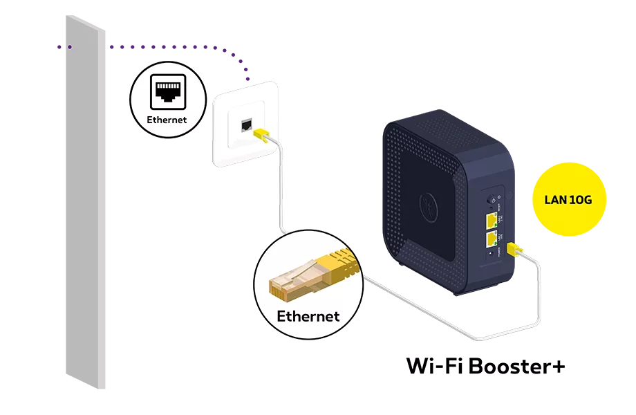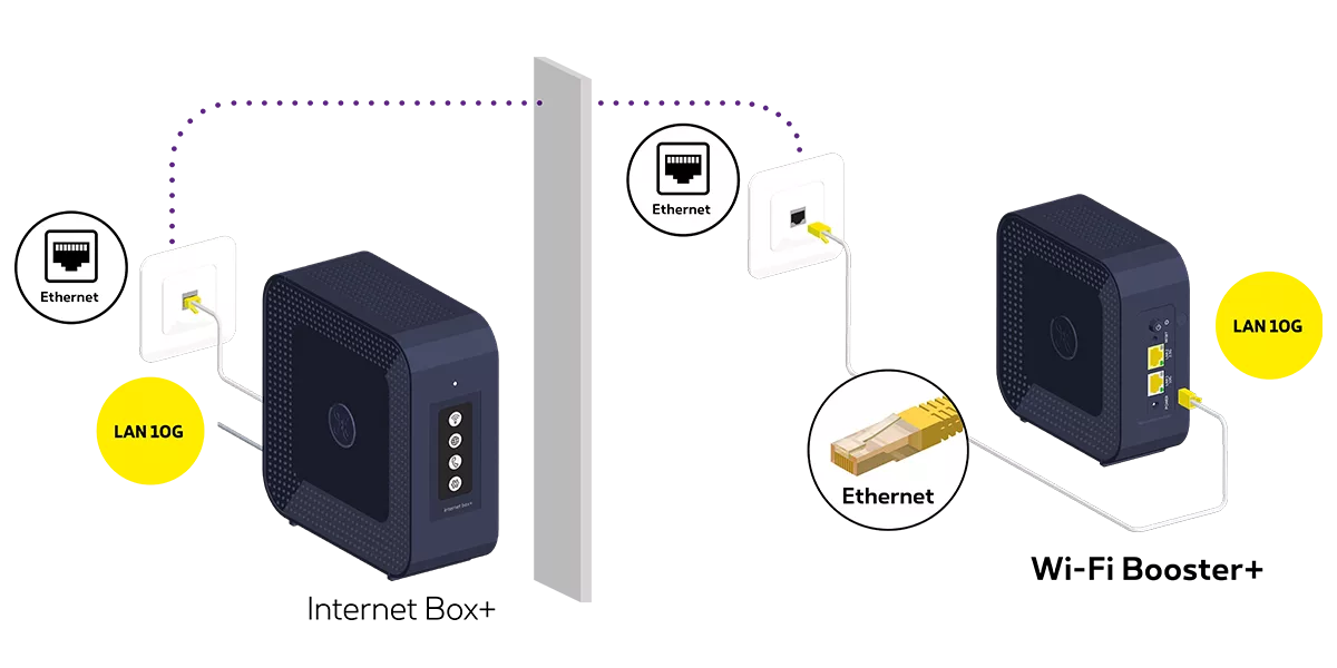 Gebruik de ethernetkabel en steek het ene uiteinde in de gele 10G-LAN-poort aan de achterkant van de Wi Fi Booster+. Steek het andere uiteinde van de ethernetkabel in een ethernetstopcontact in je woning. Kijk na of deze met de Internet Box+ verbonden is.