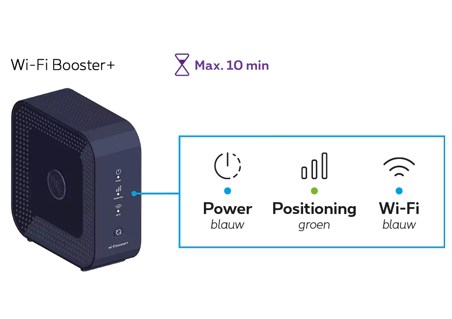 op de Wi-Fi Booster+ tot het -lampje wit begint te knipperen (dit kan 10 seconden duren).