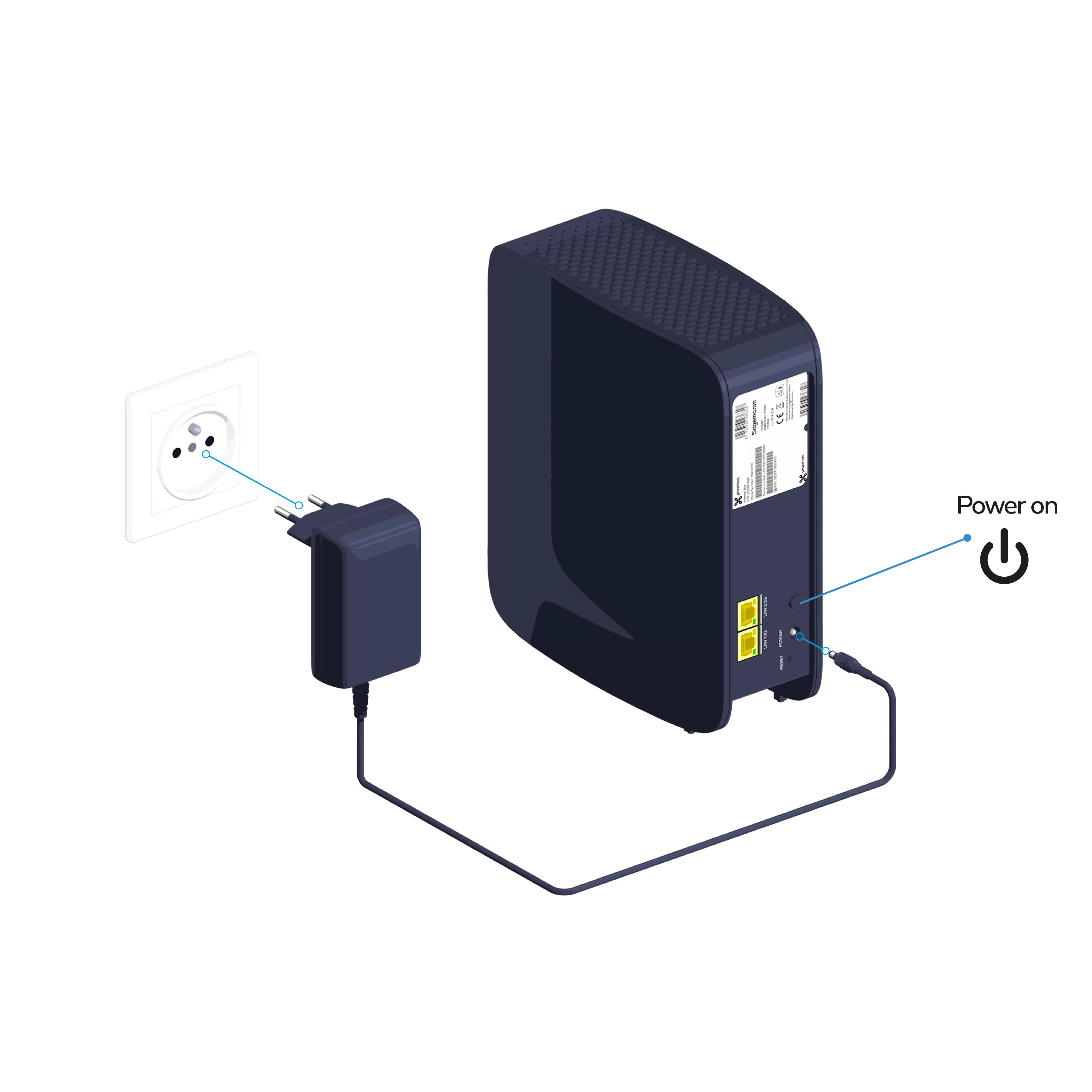 Steek de voedingskabel van de Wi-Fi Booster+ in een stopcontact in dezelfde ruimte als de Internet Box+. Druk op de POWER-knop. Het lampje