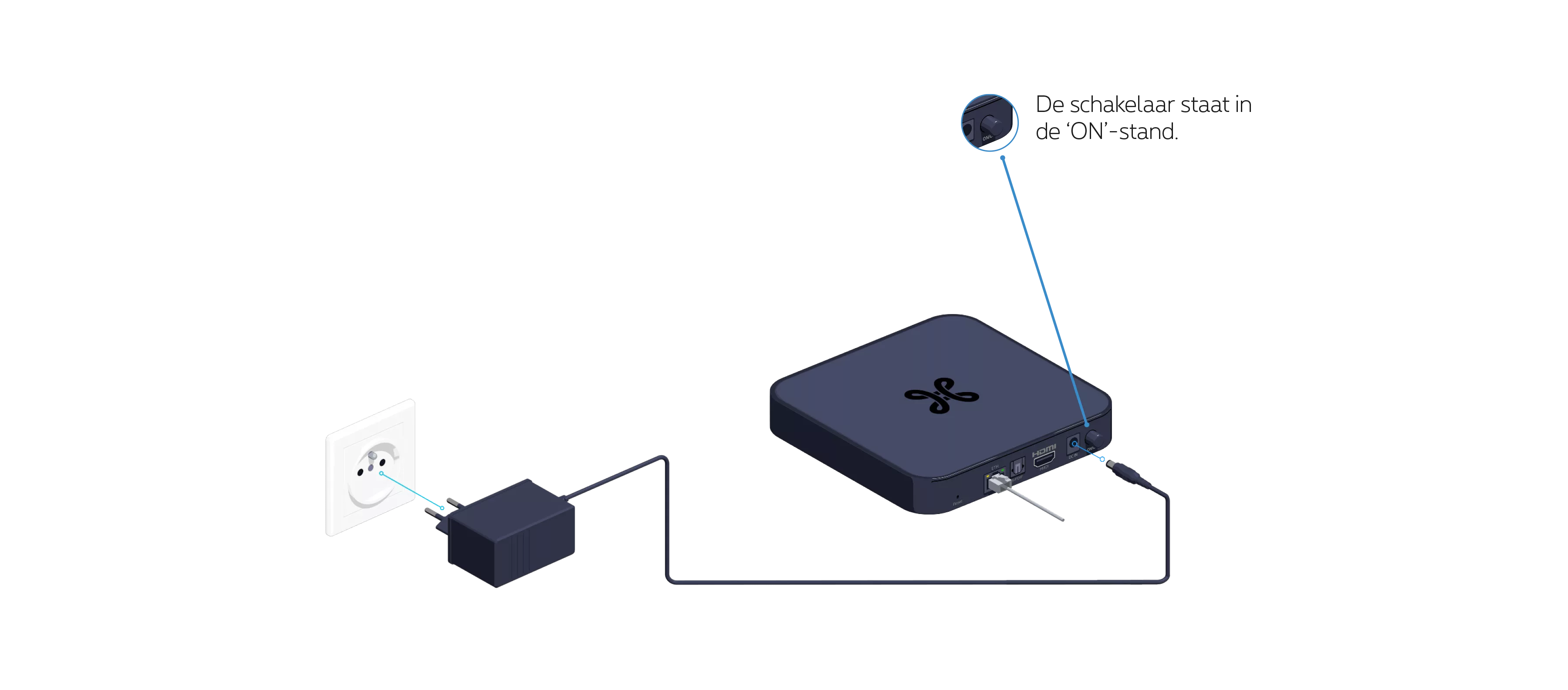 Plug de elektrische voedingskabel in je TV Box en steek de stekker in het stopcontact.
