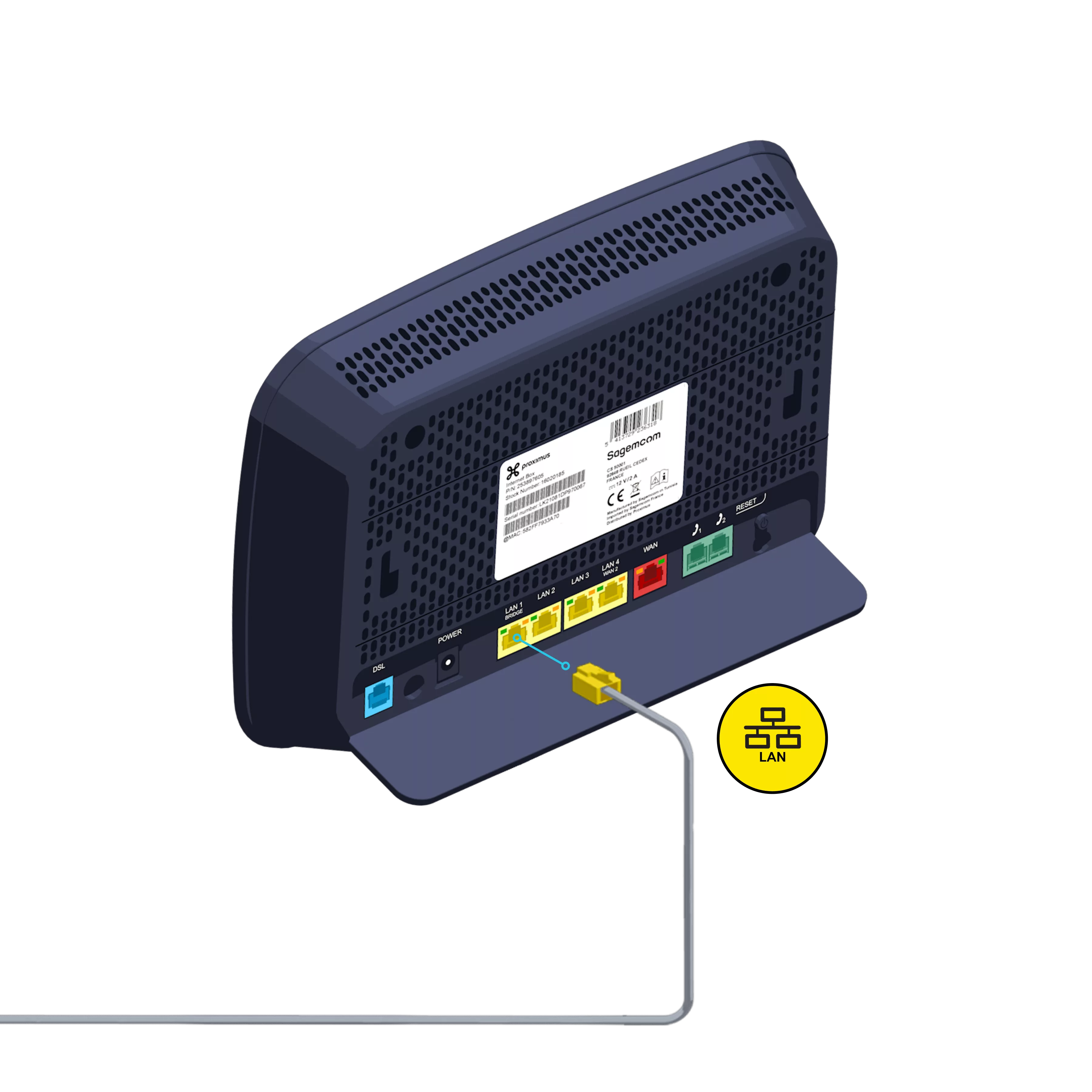 Gebruik de ethernetkabel en sluit deze aan op een van de gele LAN-poorten aan de achterkant van de Internet Box.