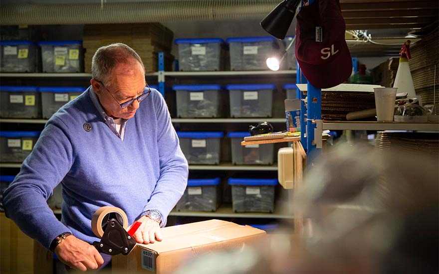 In zijn depot in Schaarbeek stockeert hij nauwgezet zijn merchandise en bereidt hij de bestellingen voor. Het allerliefst gaat hij op pad. “Als de zon schijnt en ik mag leveren bij klanten, dan ben ik echt gelukkig.”