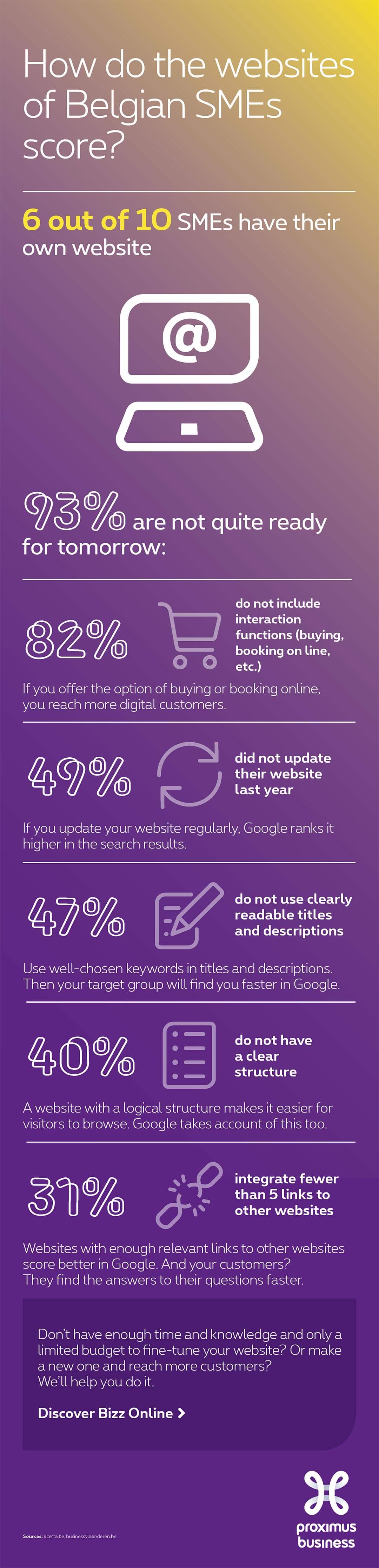 Slechts 4 op 10 zelfstandigen hebben een eigen website. Met 6 op 10 zijn de kmo’s relatief goed online vertegenwoordigd. Terwijl een website vroeger vooral een visitekaartje was, is die ondertussen een echte commerciële tool geworden. Kmo’s zijn mee met deze ontwikkeling. Toch zijn er nog verbeterpunten voor 9 van de 10 websites. Is jouw website up-to-date?