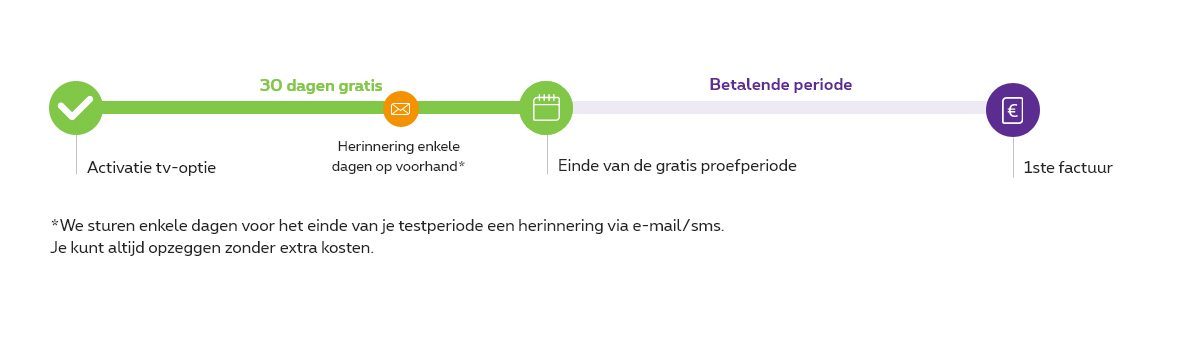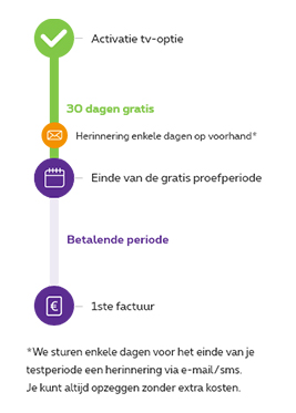 Wil je na deze gratis maand de tv-optie houden? Perfect! Je hoeft in dat geval helemaal niets te doen. De tv-optie blijft automatisch geactiveerd, zolang je deze niet opzegt. Je betaalt dan voor de eerste keer op de volgende aanrekening, na je gratis maand.