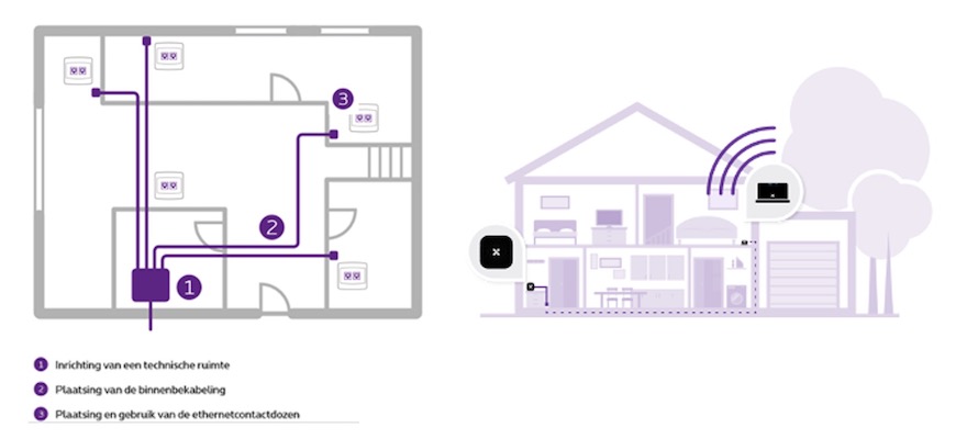Idealiter zou je in iedere kamer twee ethernetstekkers moeten voorzien en verbinden met een ethernetkabel die naar de technische ruimte leidt. Dit vraagt wat extra werk, maar heeft als voordeel dat je overal gegarandeerd een stabiele en sterke internetverbinding hebt. Bovendien is een Wi-Fi Booster aangesloten op een ethernetkabel op de bovenste verdiepingen de beste garantie voor de verbinding om te werken in het hele huis. Bedrading en wi-fi zijn dus complementair.