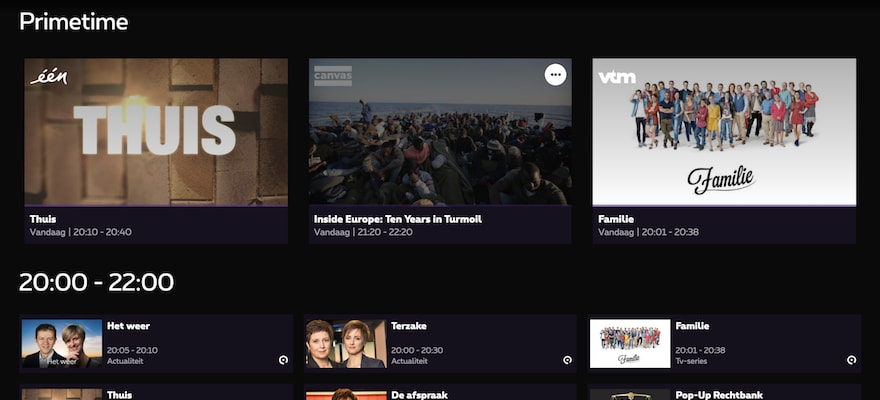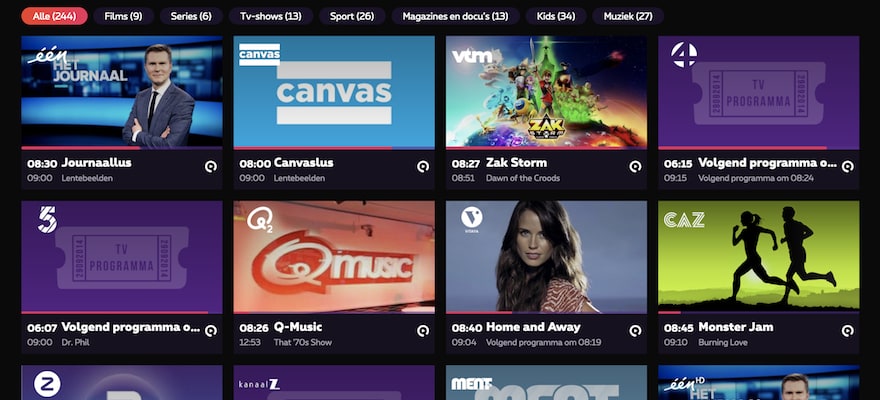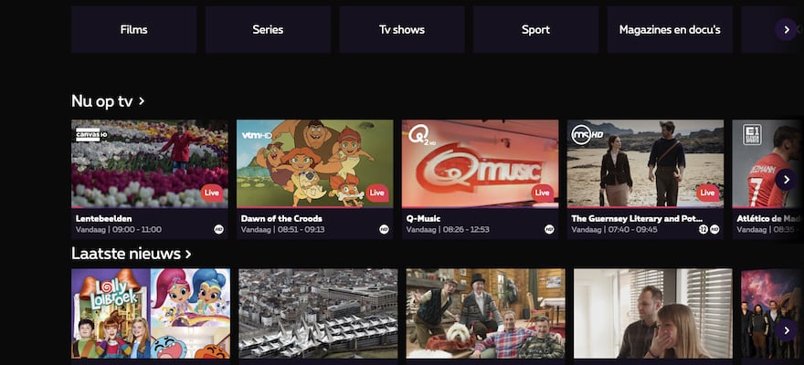 Alles begint natuurlijk hier. Om te beginnen tonen we je in ‘Nu op tv’ in één oogopslag wat er momenteel op de eerste tien zenders te zien valt. Net daarboven vind je verschillende buttons, waarachter we de programma’s per categorie handig bundelen. Zo krijg je kijktips voor volgende soorten, naargelang je goesting op dat moment: