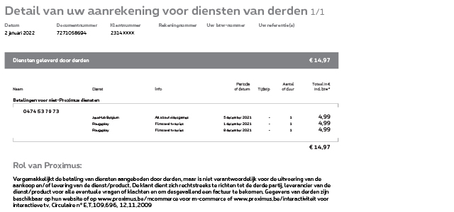 Proximus int de bedragen (inclusief btw) en maakt ze over aan de externe dienstverleners..