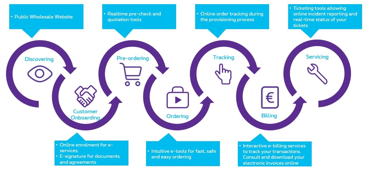 The account team is supported internally by two other important roles. The Proximus Wholesale product managers are the owners of the product portfolio. By keeping an eye on current and future market evolutions, they work to keep our products best-in-class and future-proof. The Proximus Wholesale Digital Experts are the owners of the digital tools and interfaces we offer to you. They develop new API’s and tools to make your interactions with Proximus seamless and efficient.